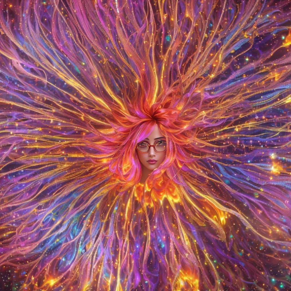 Prompt: A vibrant portrait of a laughing woman radiates surreal energy, her large glasses reflecting an explosive, fiery pattern. Her billowing hair appears like swirling golden clouds, while abstract, flame-like patterns and cellular shapes surround her. Her skin shimmers in ethereal purple tones, contrasting the blazing environment.