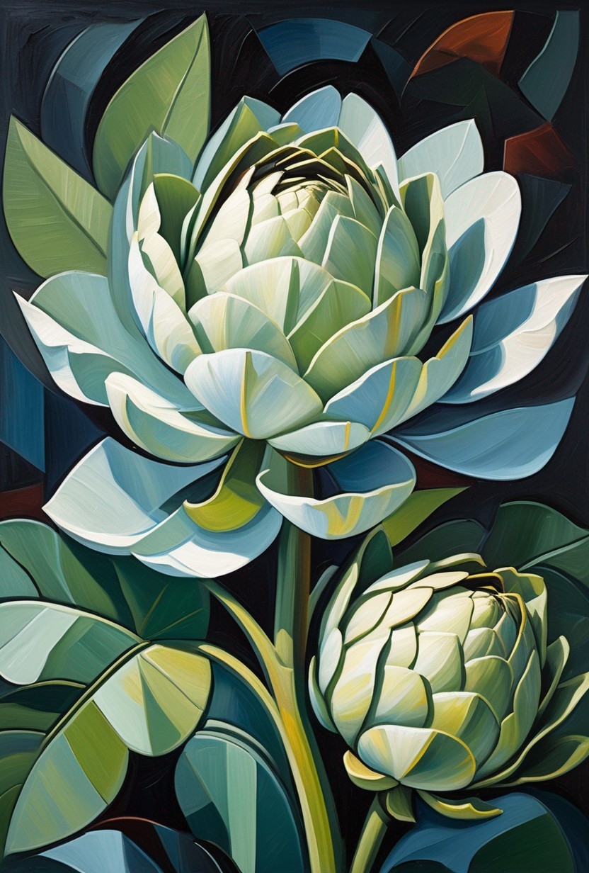 + Prompt:Create an oil painting of the base image artichoke flowers in a cubist, geometric style with thick impasto application in the manner of Picasso, Marc Dunford, and Adam Pyett.