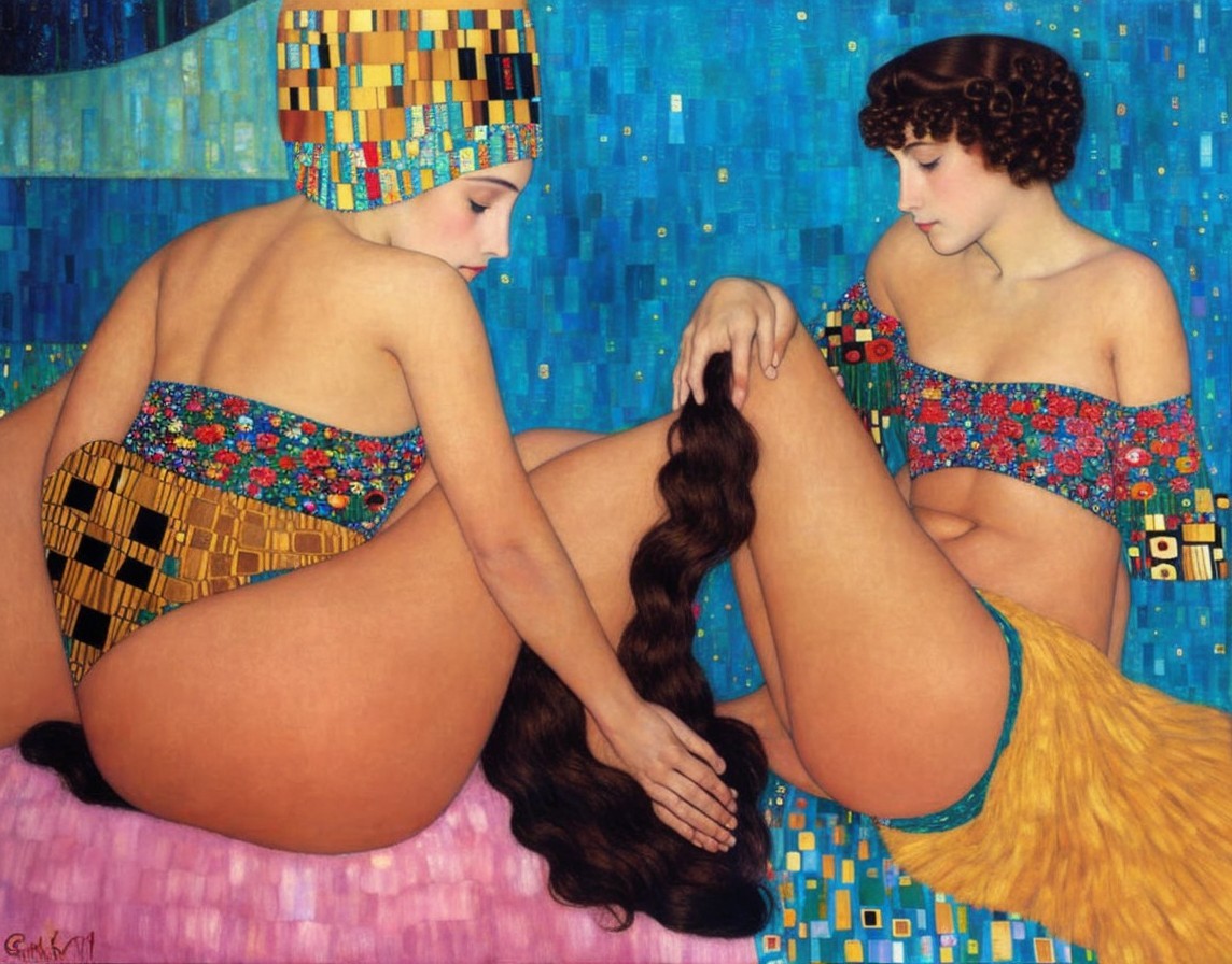 Two stylized female figures in futuristic attire by a pool, striking a reflective pose with a hint of retro sci-fi aesthetic.