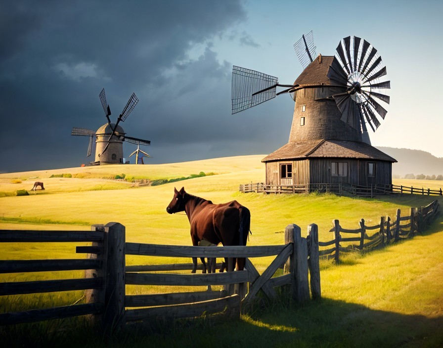 Rural landscape with windmills, grazing horses, fences, and cloudy sky