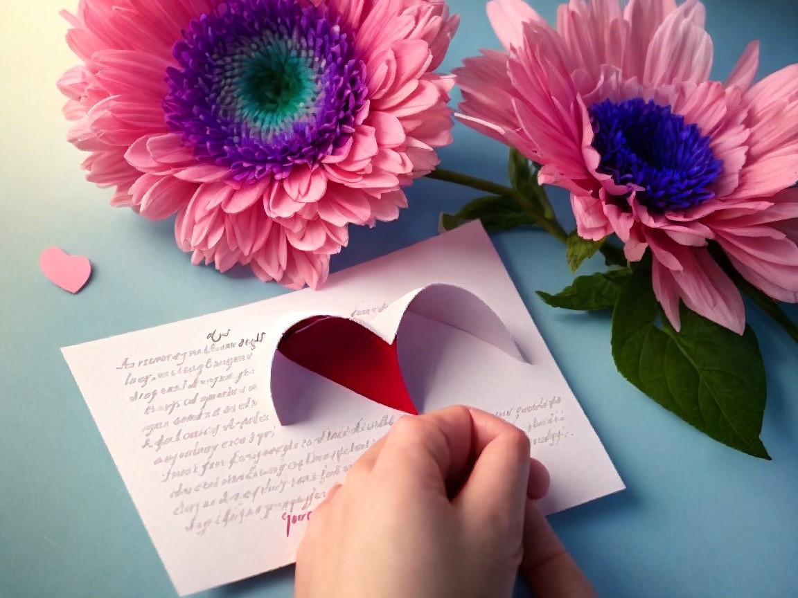 A delicate hand holds a gold bracelet and a ring next to vibrant pink flowers. A heartfelt note with a heart cutout complements the elegant display, evoking love and affection.