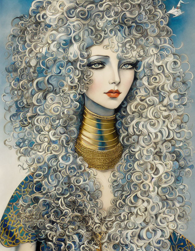 Blond Curly-Haired Woman Artwork with Blue Skin and Gold Neck Rings