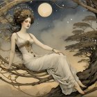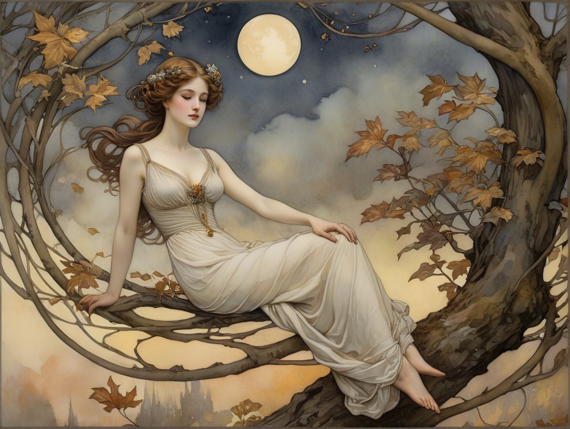 A serene woman in a flowing gown sits gracefully on a tree branch, surrounded by autumn leaves. The moon casts a gentle light in a dreamy sky filled with soft clouds.