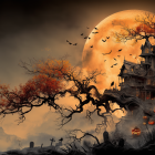A spooky, eerie landscape features a haunted mansion with glowing jack-o'-lanterns against a large full moon. Gnarled trees and flying bats enhance the Halloween atmosphere.
