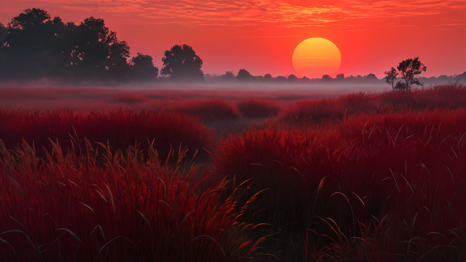 (Inspired by a prompt from Stanislav Kozenko) - A breathtaking sunset casts a vibrant red hue over a grassy landscape. Silhouetted trees dot the horizon, while mist blankets the ground, creating a serene and mystical atmosphere.