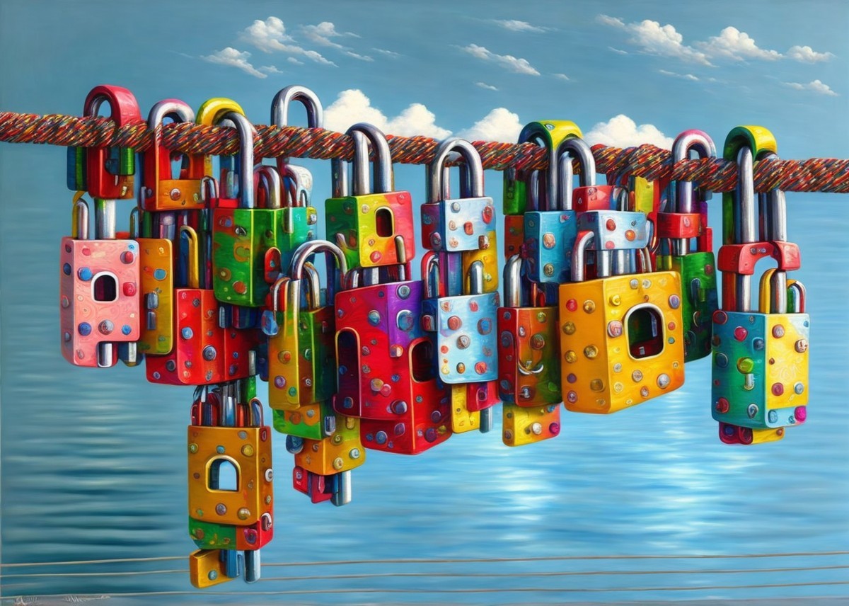 Patchwork by Iwona Lifsches and Catherina Abel. Hanging houses on the wire rope of a bridge, with a river in the background,
