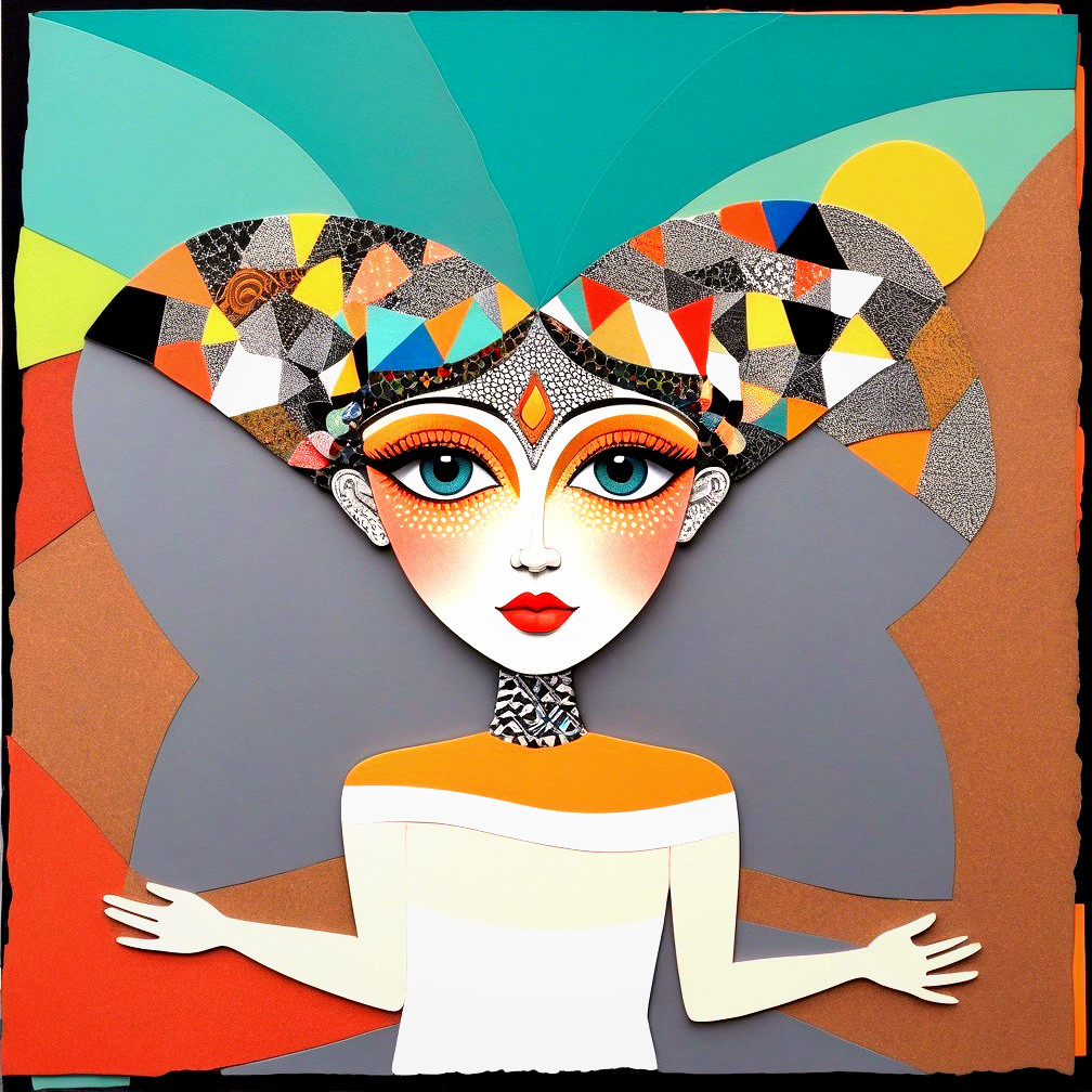Vibrant and textured upper-body portrait, collage, stylized design, hand-drawn, intricate zentangle patterns, collage background in shingle style, post-avantgarde, kinetic, jointed, congruent, high coloring, hyperdetailed, grain, blur, counterfeit, xeroxed, pointilism reference, complex and bright coloring, contoured, liminal, bioluminiscent, multi-layered eyes, mix of ink and oil, triadic color scheme metallic-honey, light-grey, light-yellow, orphism influence, impossible light transitions by Brock Hofer, asymmentrical linocut, retro-futurism and american gothic, collagraphy, great depth and scale in precise Gelsculpt 64K rendering, cel-shaded drawing style, novelty architecture, dof, bokeh, debeh, negative lucas numbers, iridescent, unique, simplistic yet romantic abstraction, tousled, opaque delicate tones in line-art, skilled, flowing, warm milky tones, slightly simplistic, hypermaximalism, tousled, chaotic, lifted, quivering. intricate precise Gelsculpt 64K rendering, plasticity 1.8, debeh, negative lucas numbers, stippled textures, unique,depth of field, bokeh, debeh, gothical fantasy elements, stippled and tesselated patterns, line work, resin coating, styled by John Buscema, dimmed lighted backdrop stained with resin, top to bottom view, shimmering lace details, crackles and contraptions, victorian and edwardian attire, abstract post-avantgarde, dreamy dystopian portraiture, juminocore, stylized illustration, colourful surreal lineage forms. Color glitch, magical realism, merged styles of ho baron and man ray and John buscema, dyed cubist reminiscence by Mark Chagall and Georgia O'Keeffe, beautiful line-art, intricate indiecore details, light and dark linework, orphism, complexion 1.4, dynamic lighting, stylization 1.4. flowing hair illusion, dethereal atmosphere, layers of fabric merging with turbulent flares, artwork inspired by Frank Frazetta, patchwork theme, octane render illustration, luminosity 1.3, brightness 1.3, geometrical, dyed, cel-shaded orphism featuring geometrical 3D effects, nuanced, romantic abstraction by Frank Frazetta, dyed textures, ambient occlusion 1.7, dappled lighting, rim brightness, serene, joyful, awesome