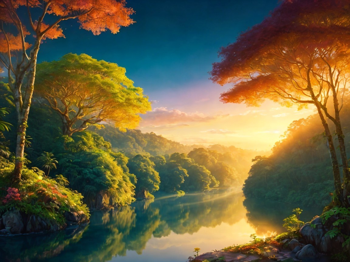 A serene landscape featuring a tranquil river winding through lush greenery. Vibrant autumn leaves adorn the trees, illuminated by a warm, golden sunset, creating a peaceful, picturesque scene.
