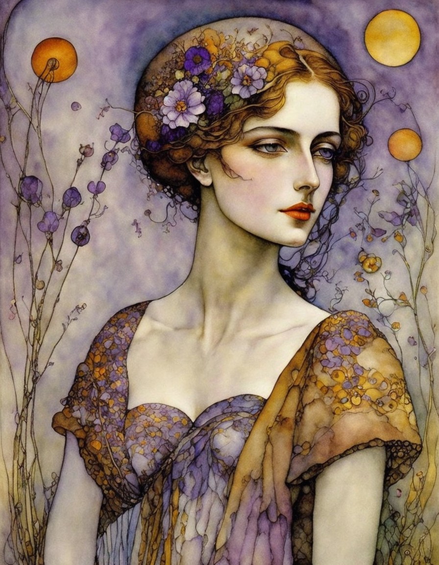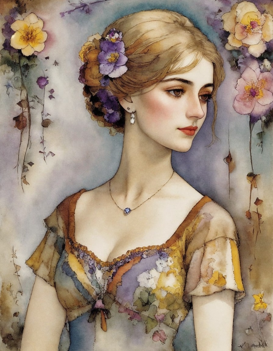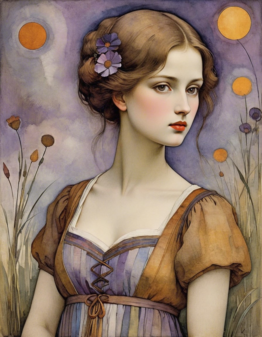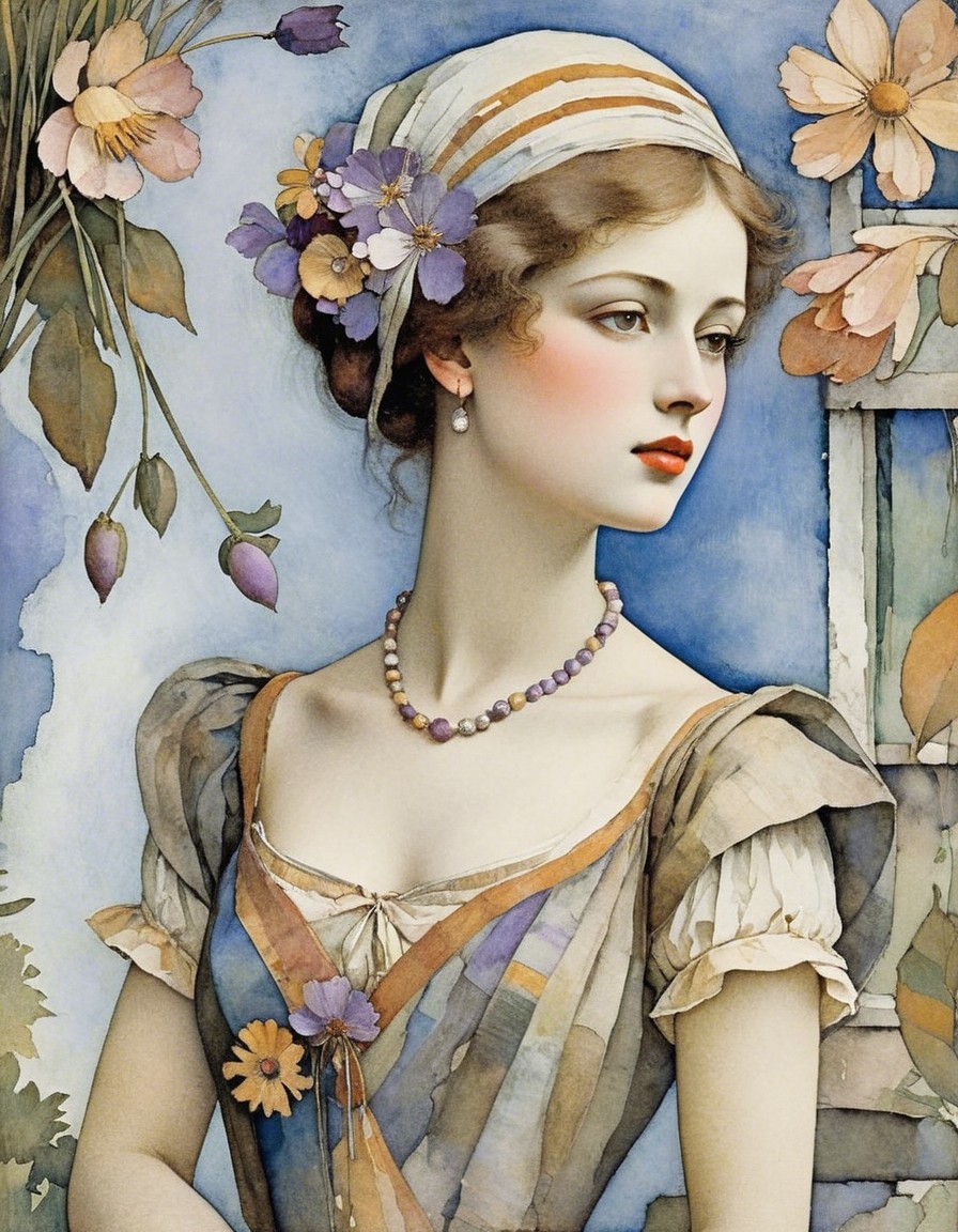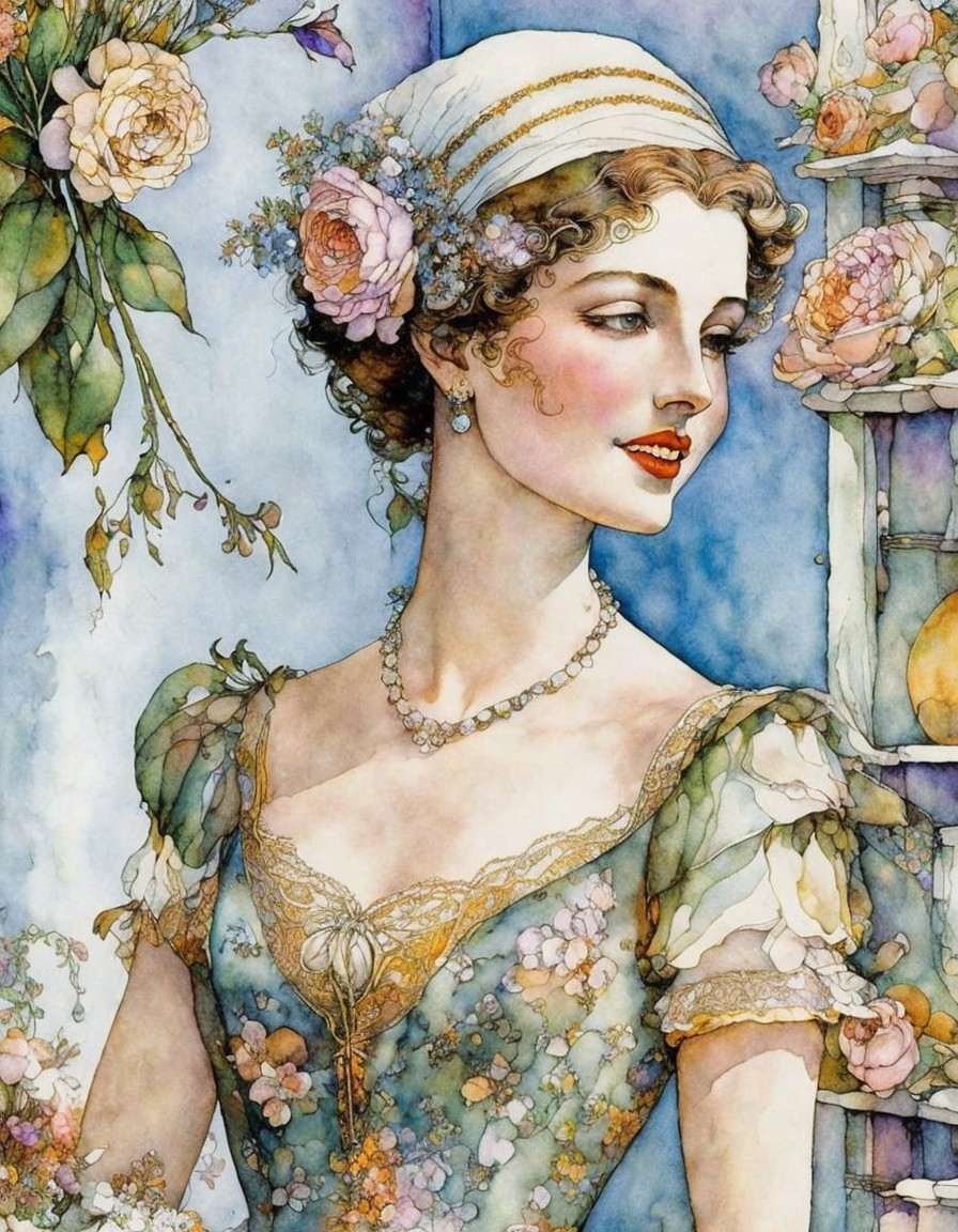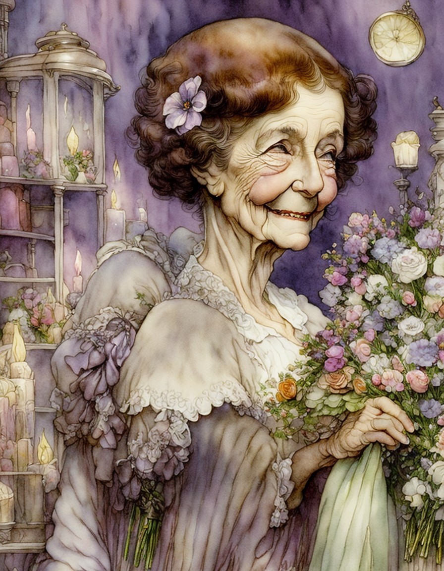 The image features an elderly woman with a warm smile, holding a bouquet of flowers in one hand and a candle in the other. She's dressed in period clothing, surrounded by vintage jars and shelves.