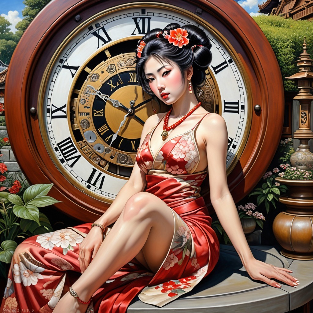 A woman in a vibrant kimono adorned with floral patterns sits elegantly beside a large clock, set in a serene landscape with traditional architecture and greenery in the background.