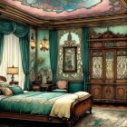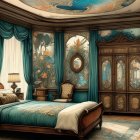 A luxurious bedroom featuring intricate wall art, vibrant floral designs, and ornate furniture. The rich blue and turquoise color scheme creates an elegant, serene atmosphere.