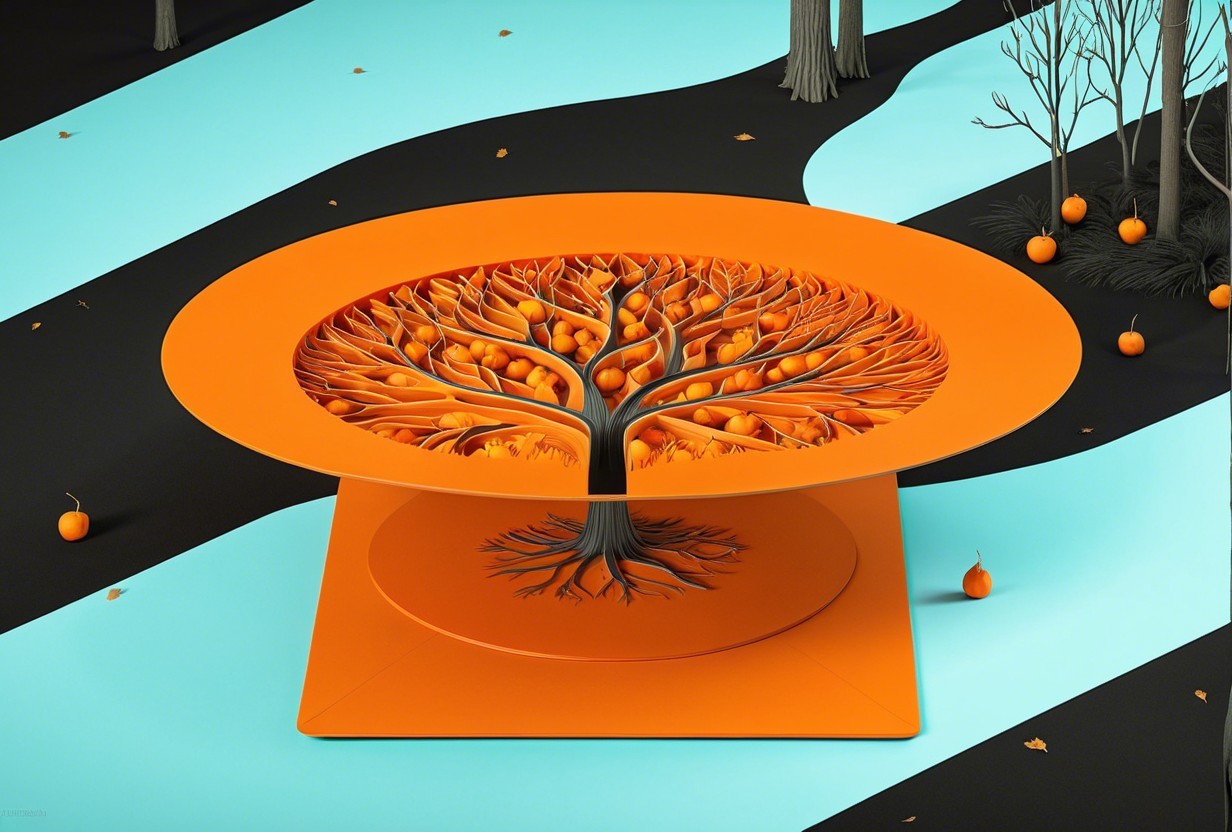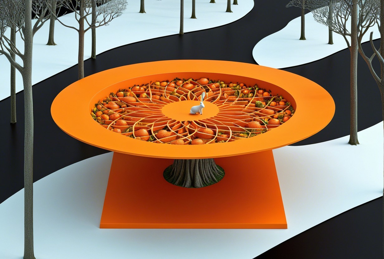 Prompt: Three Dimensional Precioso bosque con arboles con las hojas naranjas, con setas y conejos corriendo por el suelo, optical illusion, Erik Johansson, 3D, Intricate detailed artistic drawing, extremely-ultra-detailed line-art, in style of Aubrey Beardsley and Paul Corfield and George Callaghan.