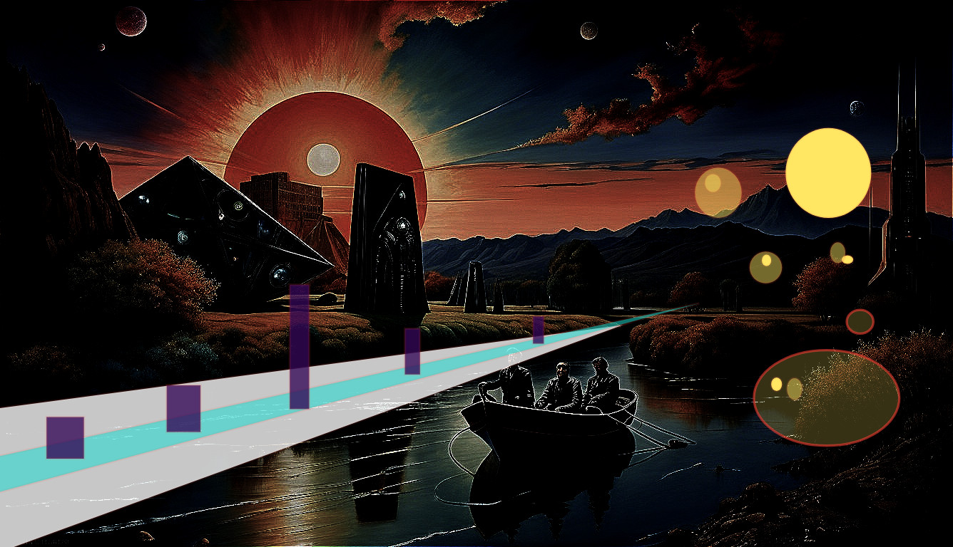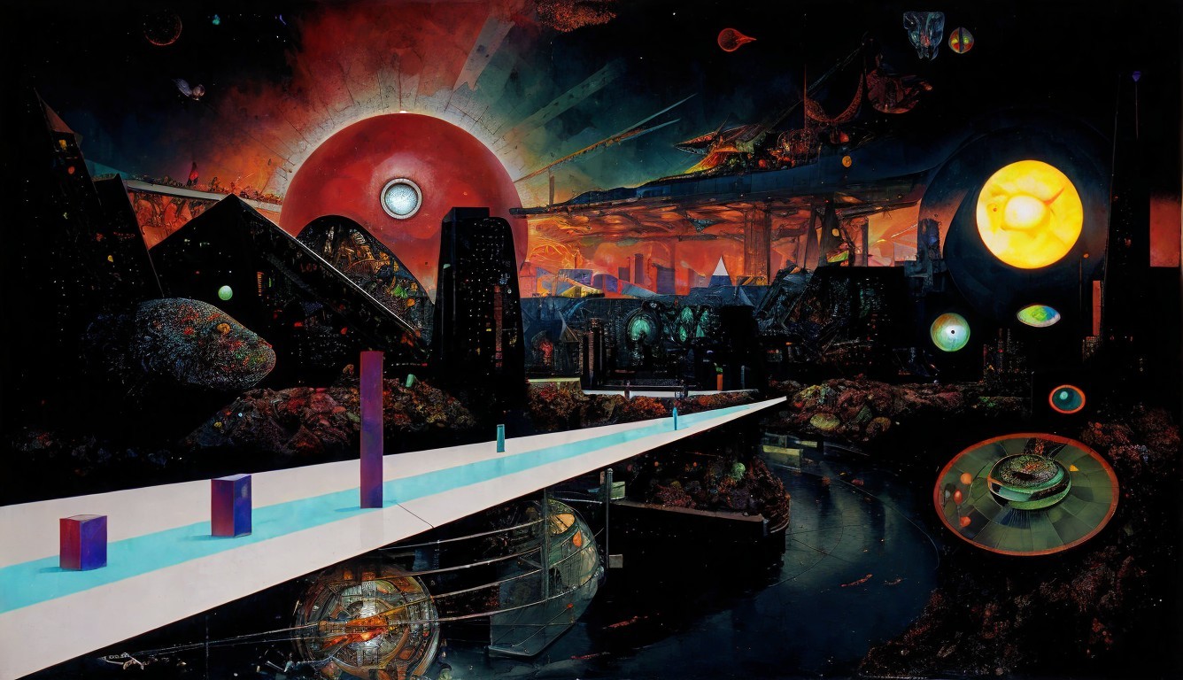 A surreal landscape features a figure on a pathway leading to a vibrant sunset with an eye, surrounded by abstract buildings and cosmic elements, blending dreams and reality.