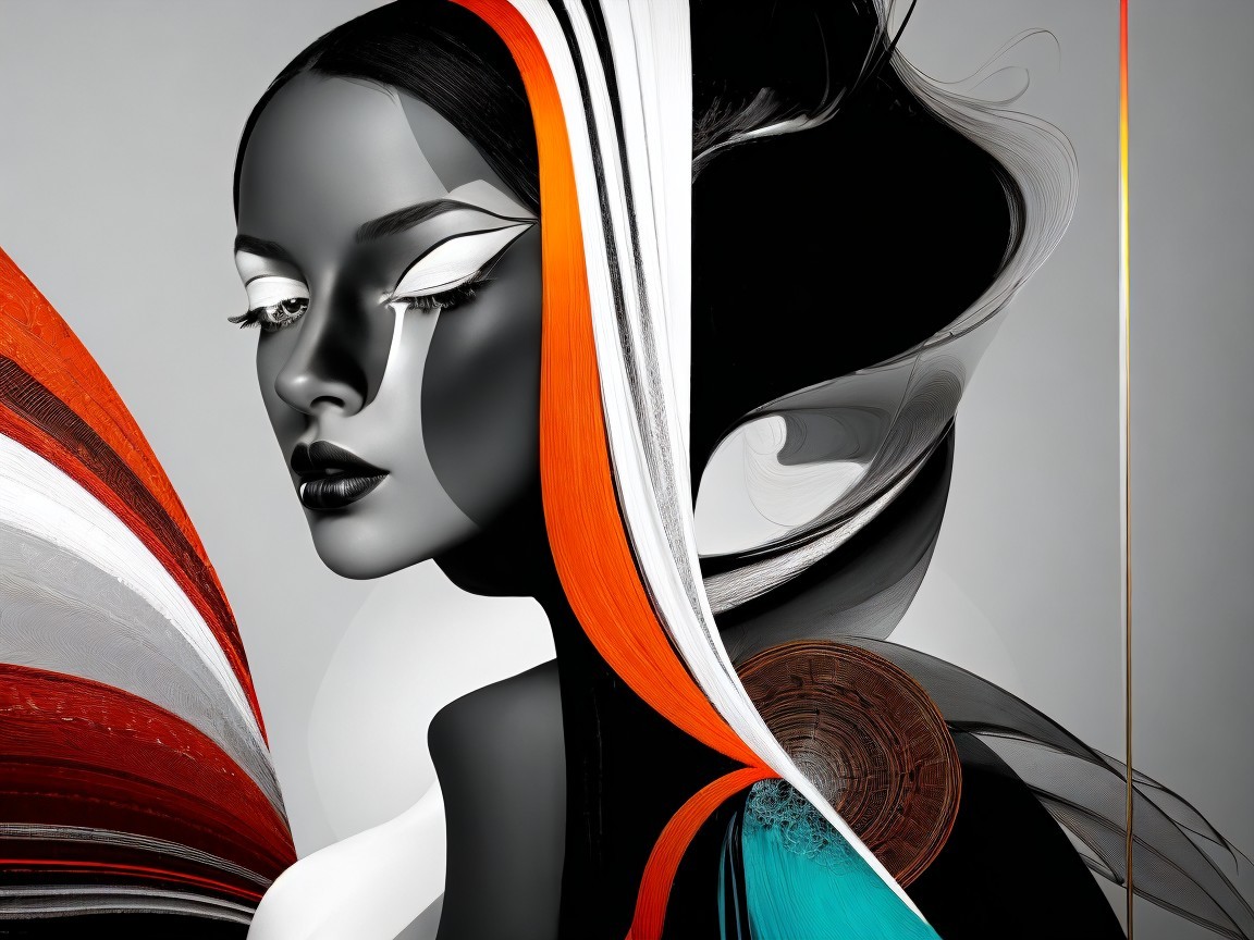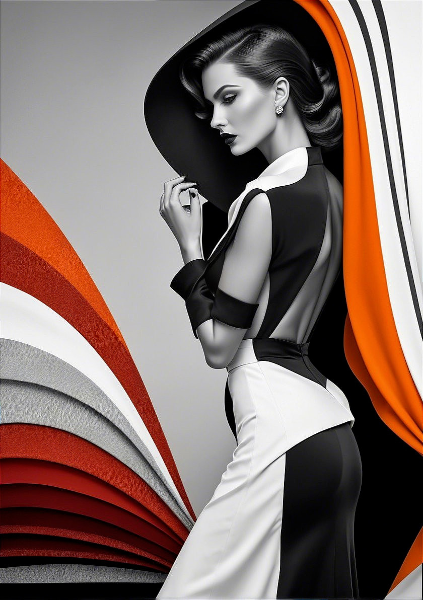 A striking black and white fashion illustration features a woman in a sleek gown. Bold, colorful waves of gray, orange, and red create a dynamic, modern backdrop, highlighting her elegance.