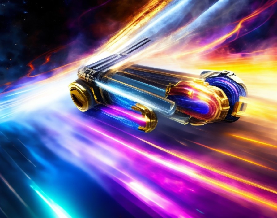 A vibrant digital artwork of a golden object with glowing edges, surrounded by dynamic, colorful light streaks, evoking a sense of high-speed motion or hyperdrive.