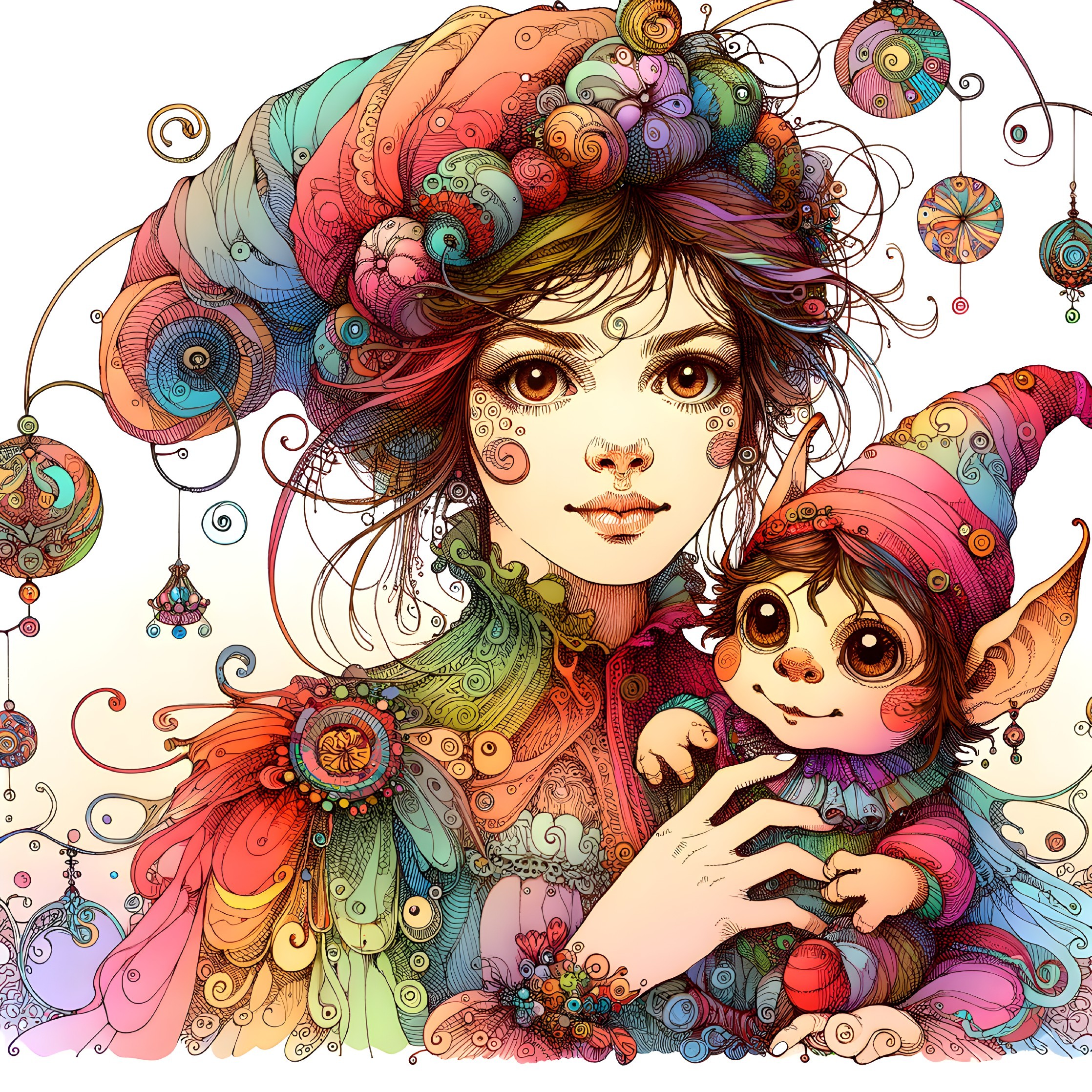 An intricate illustration of a woman with colorful, whimsical headwear accompanied by a cute elf-like creature, both adorned with detailed patterns.