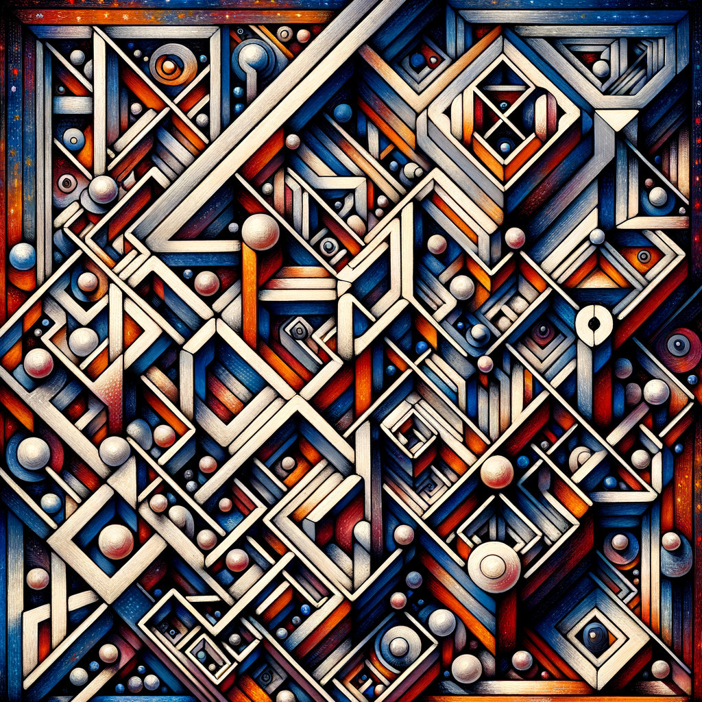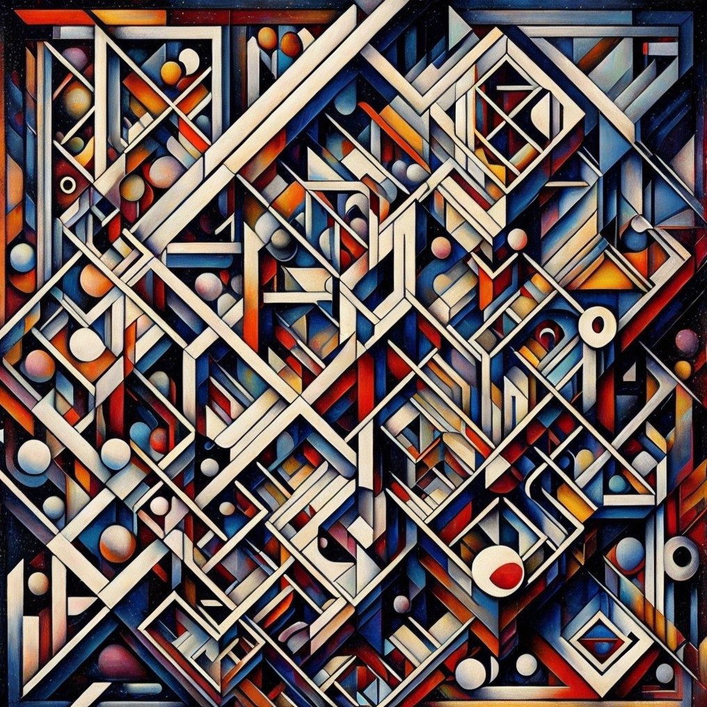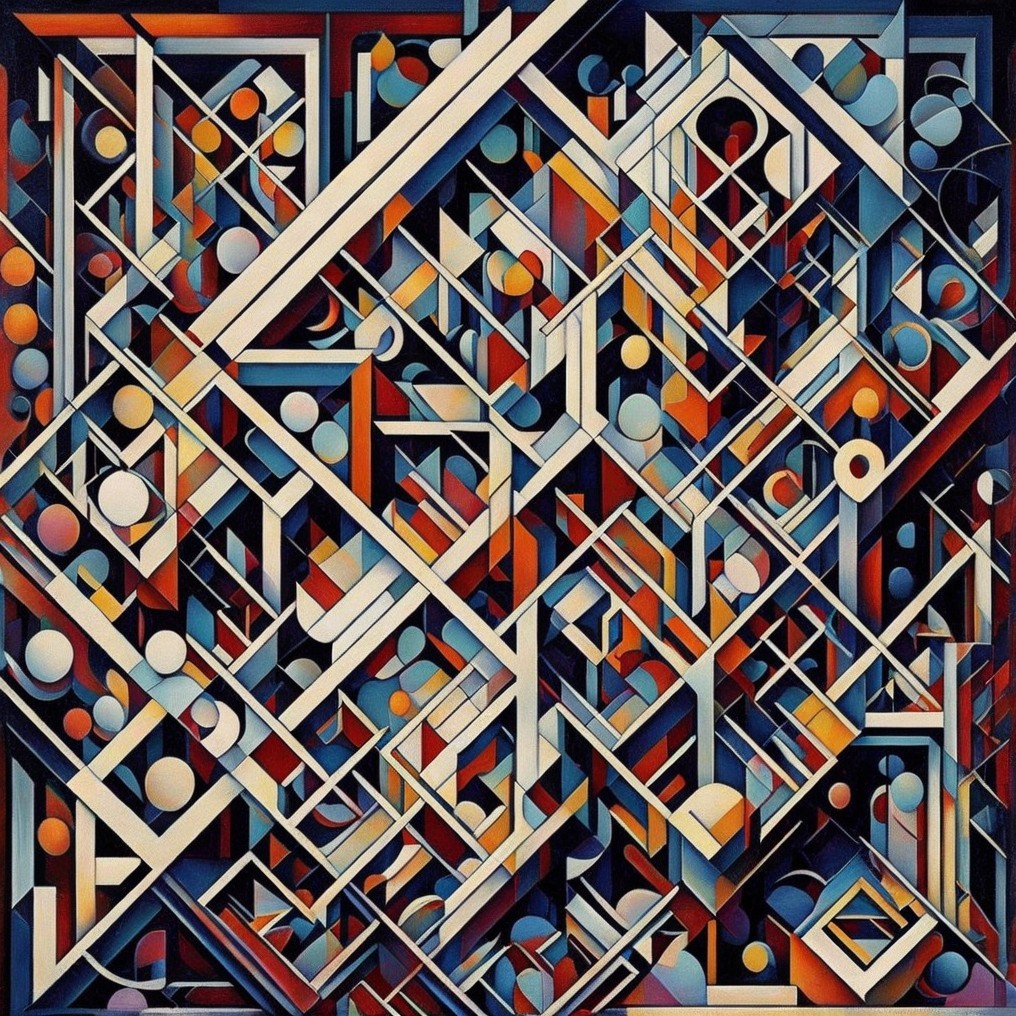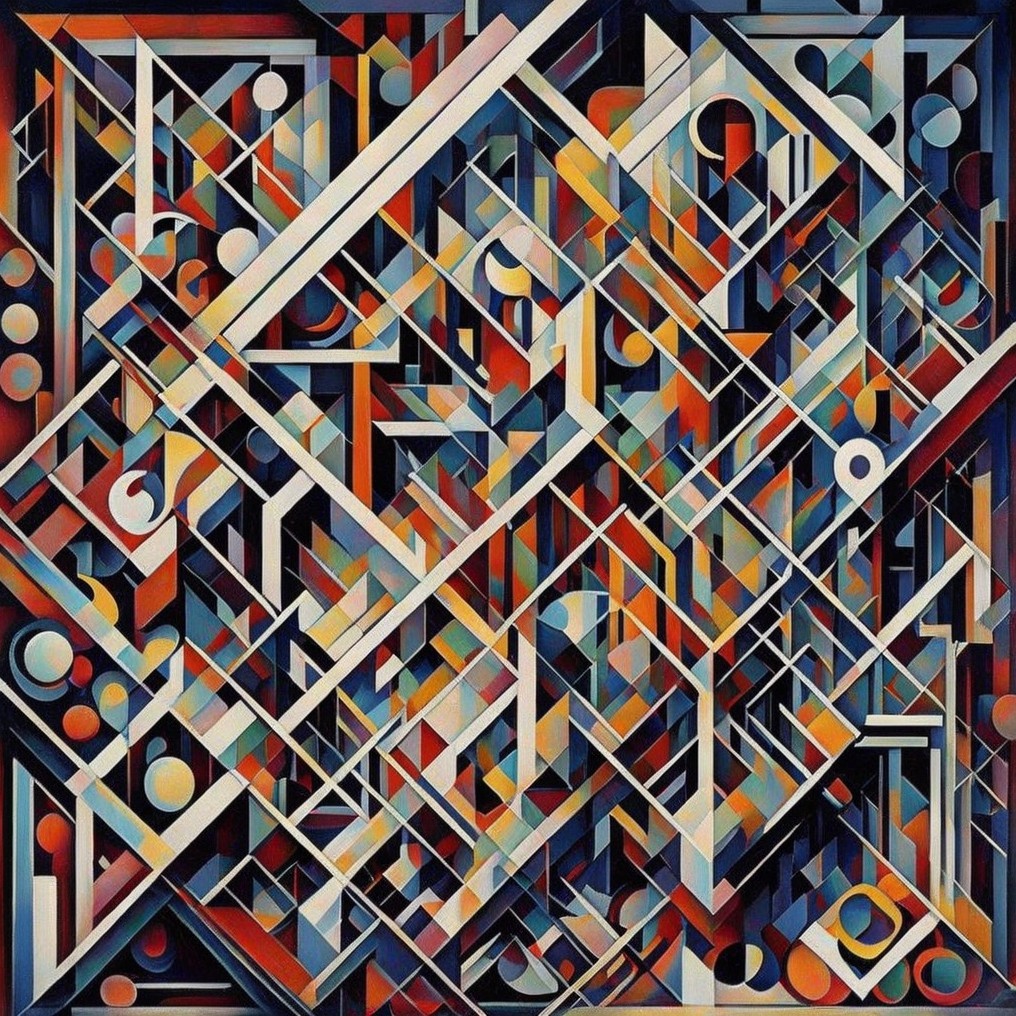 Abstract geometric painting with a complex array of lines, shapes, and colors creating a sense of depth and dynamism.