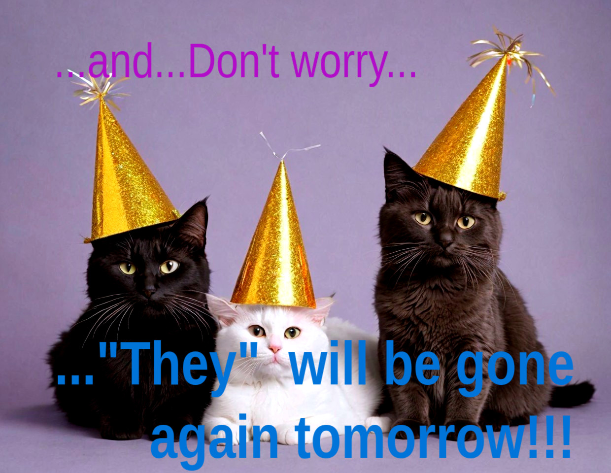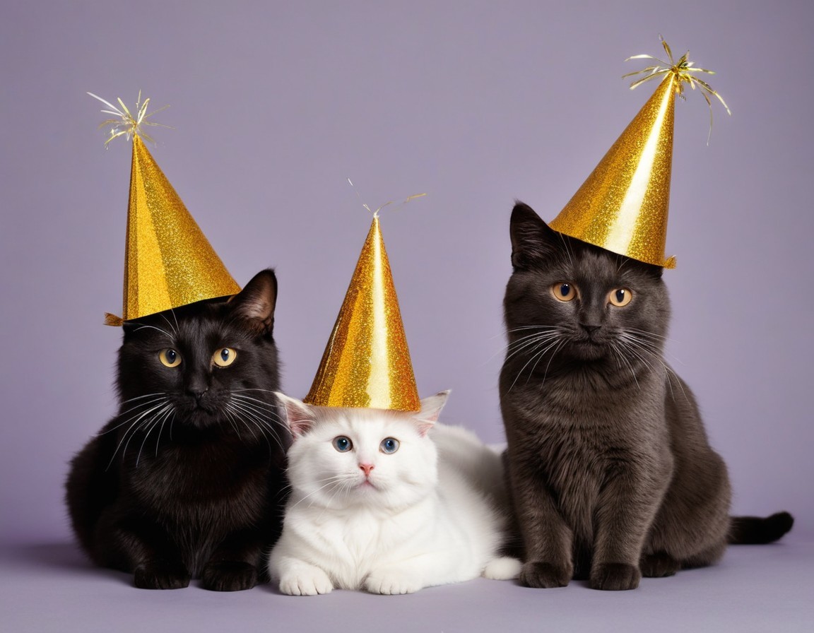 Three Cats in Gold Party Hats Against Lavender Backdrop