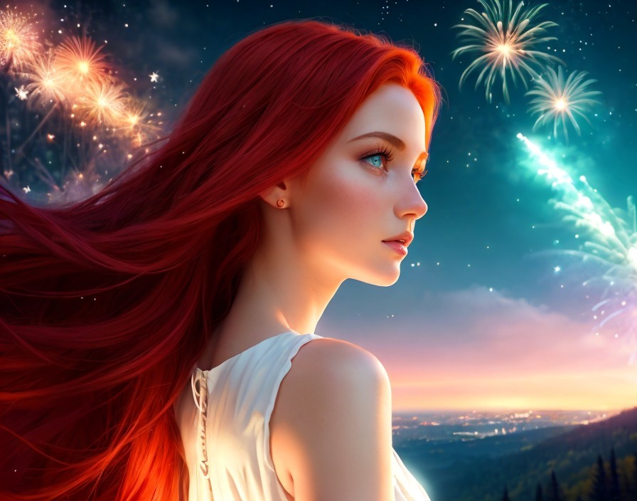 Prompt: "A young woman with Red hair and green eyes. Who watches fireworks from a hill.