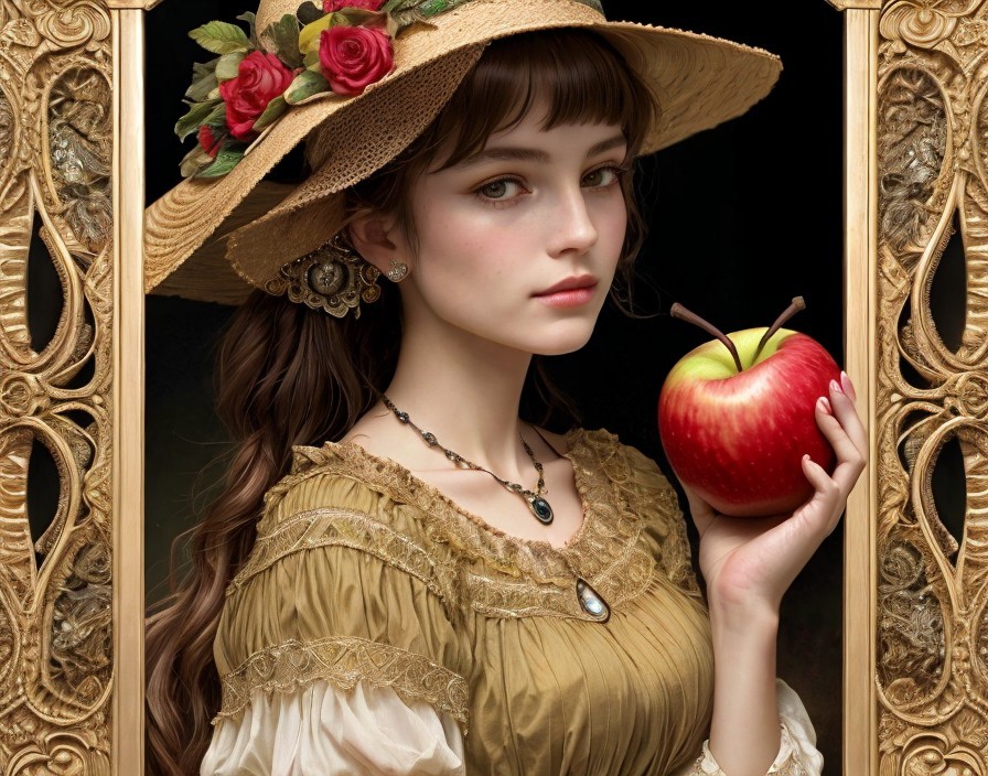 Prompt: a girl in an intricate straw hat holding a ripe rotten apple, demonic eyes glowing from the inside out, black onyx necklace of intertwined snakes, smirk on the face, Gothic great depth and scale Carne Griffiths Searching for non-obvious connections, dramatic lighting and shadows intricate details, HDR, beautifully shot, hyperrealistic, sharp focus, 64 megapixels, perfect composition, high contrast, cinematic, atmospheric, moody, style by Randy Vargas_Tiago Hoisel_Craig Davison+deviantart, digital art, tarnished Leather; Dramatic, moody lighting with a focus on shadows and highlights