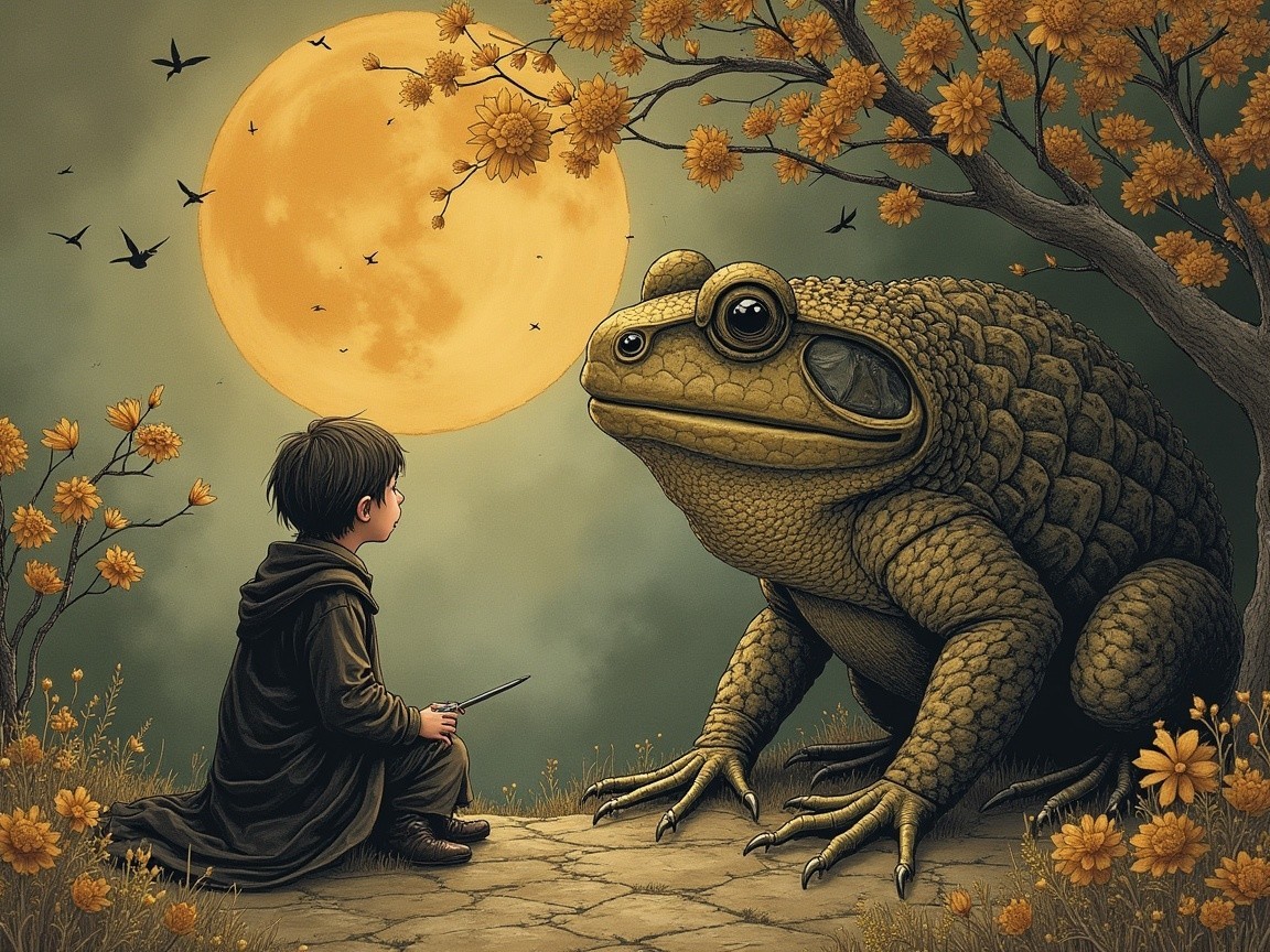 Legend of the boy and the toad, Medieval Japanese Artists Sumi-e Style, Velvet Black, Shabby, Dull Gold, olive green, Amber Gray, Golden Ratio, Surreal Fantasy, Elegant, High Definition Ultra Fine 3D Line, Zenangle Style, Watercolor Patchwork , Arthur Rackham Style, Paul Kidby, Gediminas Prankevicius, Jacek Jerka, Extremely Detailed, Intricate, Thoughtful, HDR, Fractal, Beautiful, Award Winning, Fantasy Look, Fantasy, Crisp Quality