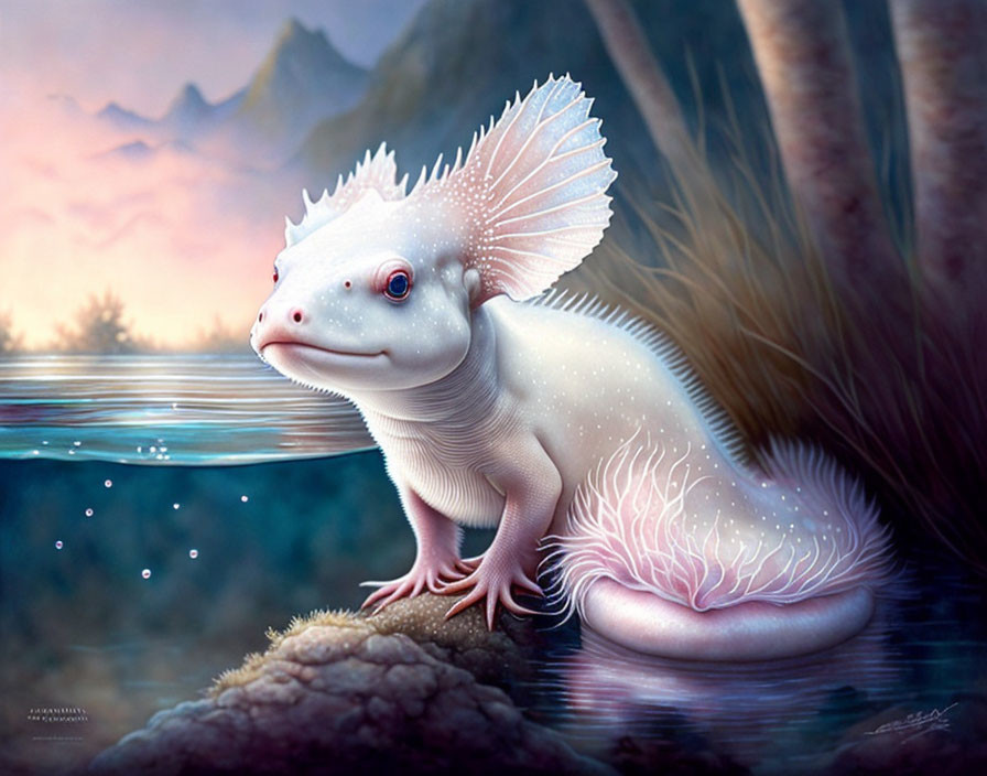 Fantastical axolotl-like creature with gills and spots in twilight setting