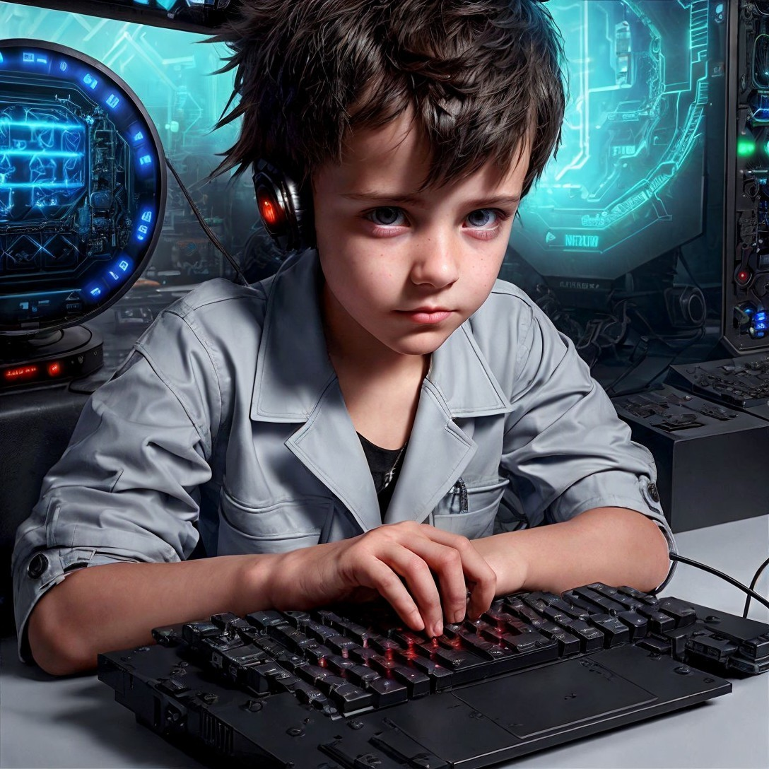 A young child with a serious expression plays on a backlit keyboard, surrounded by futuristic tech and glowing blue lights.