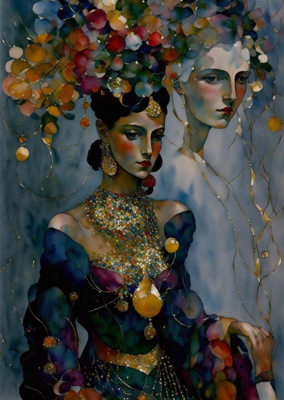 A watercolor painting of a woman with an elaborate updo and ornate attire, adorned with pearls, exuding elegance.