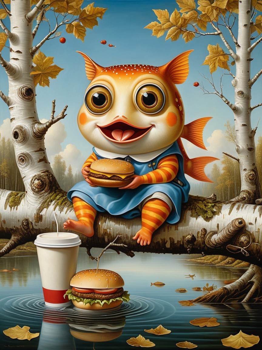 A whimsically painted full-body portrait captures a charming, fish-like creature with cartoonish large golden eyes, a wide, open mouth revealing a protruding tongue, and a happy expression. This creature, adorned with freckles on its forehead and cheeks, has orange-and-white striped legs and