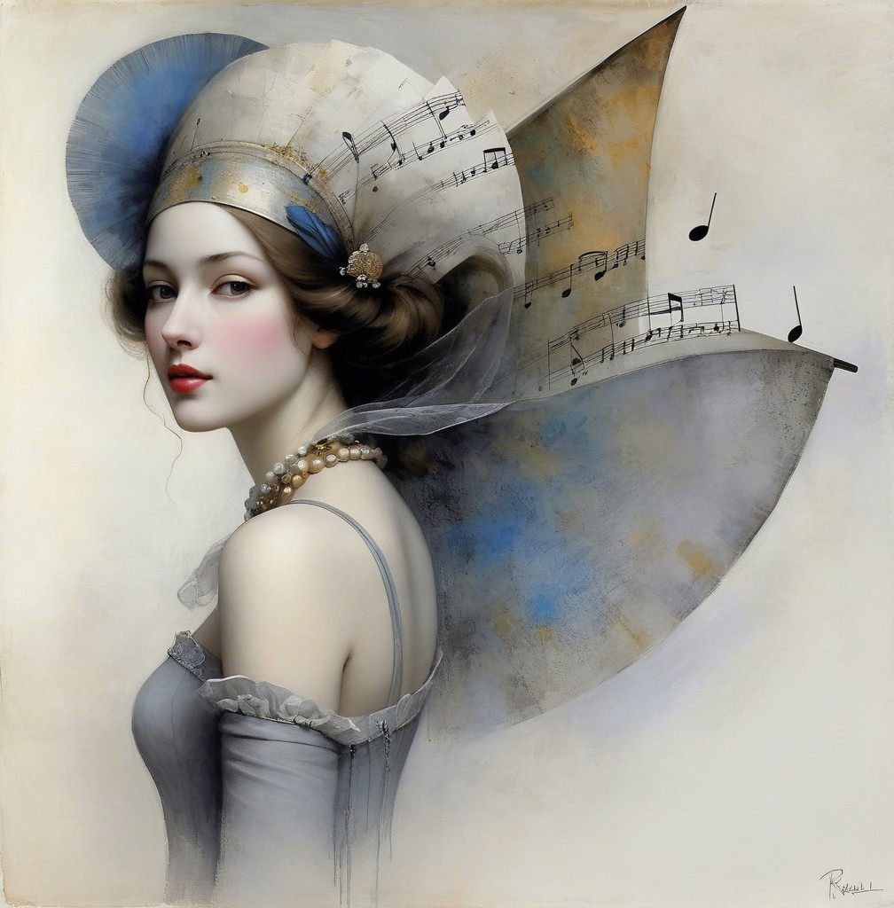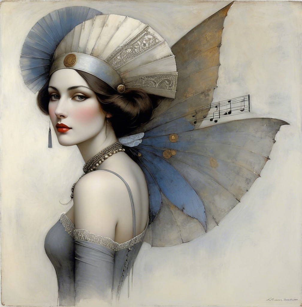 A graceful woman adorned in elegant attire, featuring intricate designs and a striking blue color palette. Her elaborate headpiece and wings add an ethereal quality to her captivating appearance.