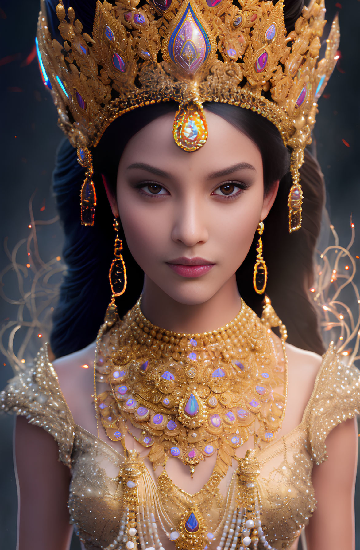 + Prompt:Crown Chakra Queen with an intricately detailed Laotian temple headdress, stunning, mysterious magic spells, highly intricate, hyperrealism delicate detailed complex, vibrant colors, by Tom Bagshaw, Asher Brown Durand, Beeple, Todd McFarlane, Ralph Steadman, Anna Dittmann, Dan Mumford, Magali Villeneuve