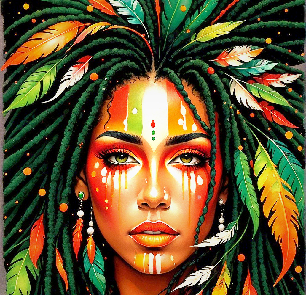flamboyant, drippy splash art. triadic color scheme red green orange. Streaks, Dreadlocks, hairstyle has a magical feel and is illuminated by myriads of scintillating tiny lights, complexion 1.2, make up, fantastical.Skimpy strokes, pointillism, particles, flecks, nasty splashes, cel-shaded, face paint, tribal-inspired markings by Susan Seddon Boulet, dripping technique, hatching, dots, cubistic style, intricate cuts, saturated colors on old paper, shimmering, ethereal, vivid colors, high quality AI art, diffuse lighting, ambient occlusion, Polished, Masterful, Photorealistic, unreal engine, 128K, UHD, crisp quality, light reflections, highest quality AI art, light art composition, ultra-realistic, sharp, clear realism, pencil sharp edges, rich texture, warm coloring, clear,, glowing, gouache, impasto tempera, plushy detailed hairdo, cottagegore 1.7, american gothic 1.7, colorful reflections, grain, plasticity 1.6, custom_loss: edge, vector 9:5, close up portrait, serene fantasy goddess, sunny essence, splashes, dots, flecks, luminism, action painting, streamline_moderne merged with cubistic fractalization, 3d effects 1.8, ambient occlusion 1.5, parallax occlusion 1.2, shadow mapping 1.3, 3 layers of dof, overspray of paint, squiggly, oil paint features, glossy reflections, auracore, blotting textures, dewy, Novelty architecture, precise Gelsculpt, perspective, stylized lineage drawing, RHADS, atmospheric, 3D texture, 3D shading, ultra 3-dimensional effect, octane render, dramatic lighting,golden ratio, divisionism,slightly illuminated by the remaining light, calm, tranquility, reflecting, beauty, nature-inspired, peaceful, luminism by Arlie Opal and geof darrow, serious, very high coloring, brightness 1.9