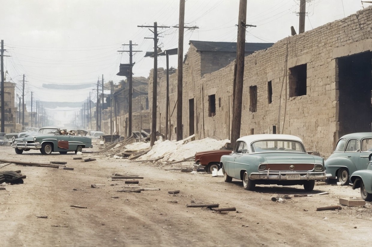 Vintage Color Photo: Old Cars on Deserted Street with Dilapidated Buildings