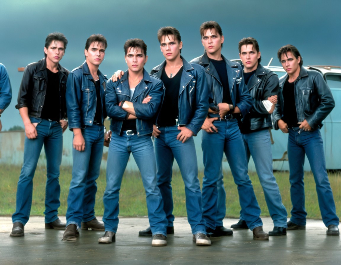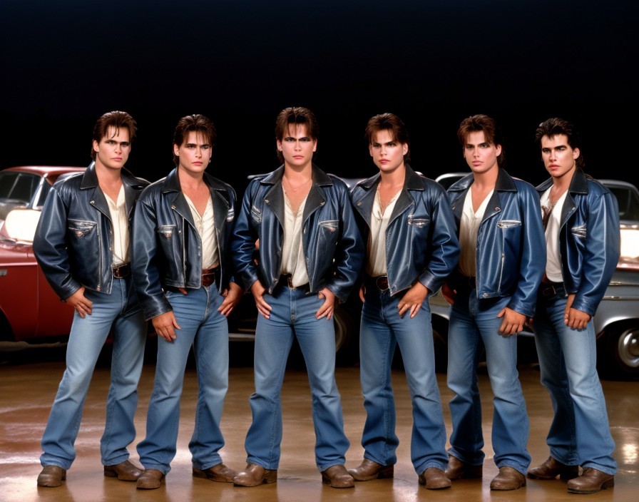 Men in Denim Jackets with 1980s Hairstyles Outdoors