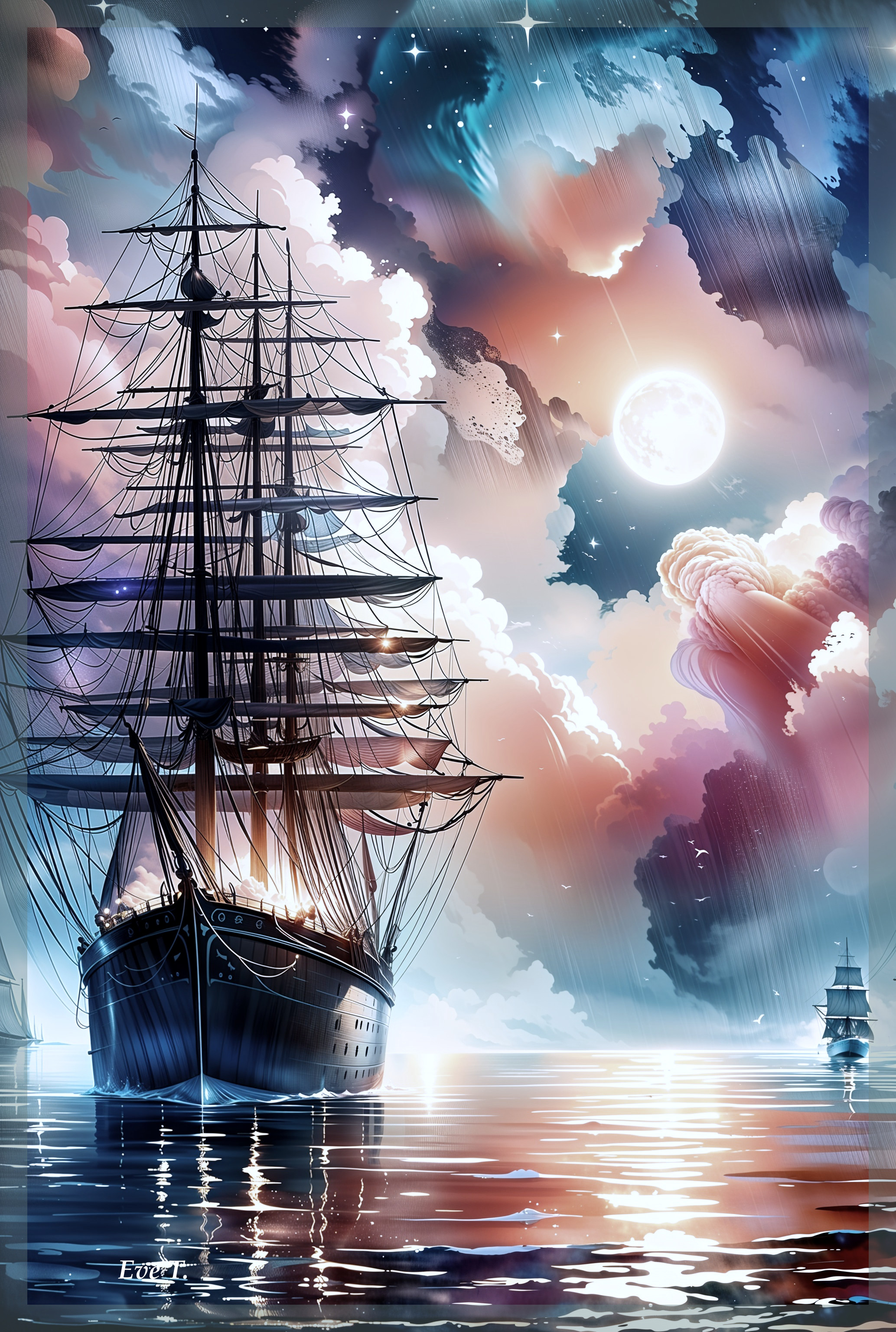 A majestic ship sails across a shimmering sea under a colorful sky filled with clouds. The moon glows brightly, reflecting on the water, creating a serene and dreamlike atmosphere.