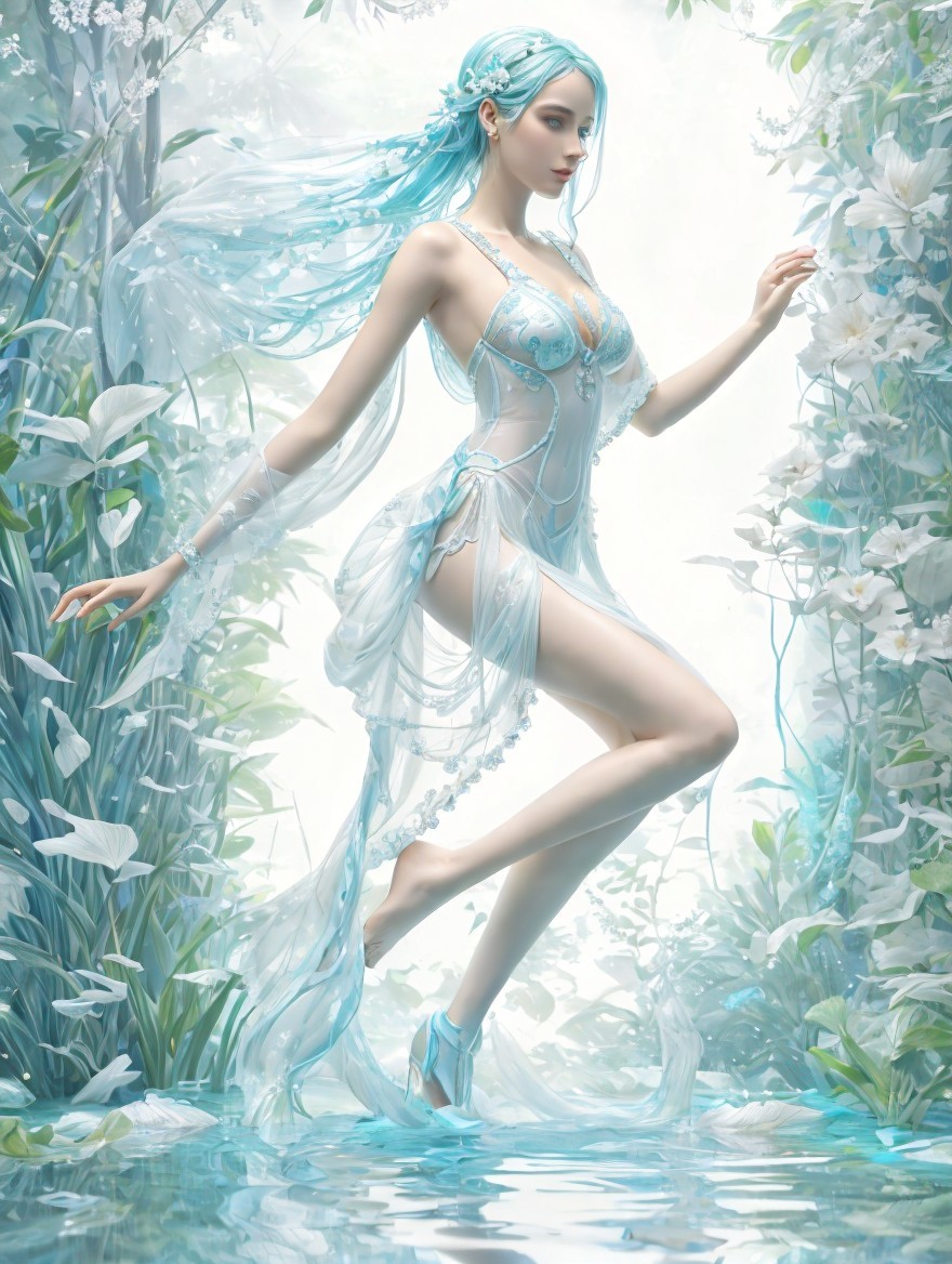 Amazing Virgo in white and blue tones. A very clear figure of a Virgo in full height, transparent flowing out of the water, among the wild jungle, in pastel colors, clearly worked out details, super clear quality, high detail, ultra intricate, ultra pronounced details, sensuality