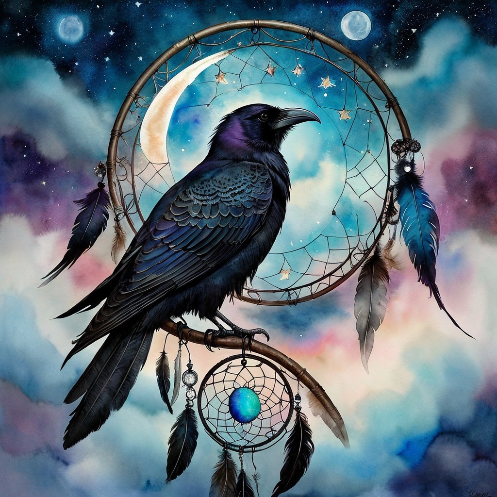 crescent moon dreamcatcher, a beautiful raven sitting in it, night, stars above, clouds below, watercolour-ink painting by Luis Royo, Victo Ngai, Alberto Seveso, digital art, Fibonacci, detailed background, hyperrealistic, hyper-detailed, dreamy, filigree, web, feathers, whimsical, ethereal, colour splash, centered, symmetry, painted, intricate, volumetric lighting, beautiful, rich deep colors masterpiece, sharp focus, ultra detailed, in the style of dan mumford and marc simonetti, astrophotography, by John Atkinson Grimshaw