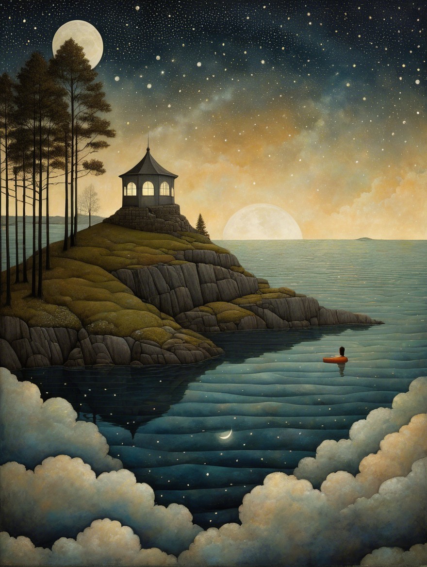 A serene landscape features a large moon illuminating a calm lake, with a silhouette of a castle on a hill. A figure stands on a dock, while another swims nearby, amidst a starry sky.