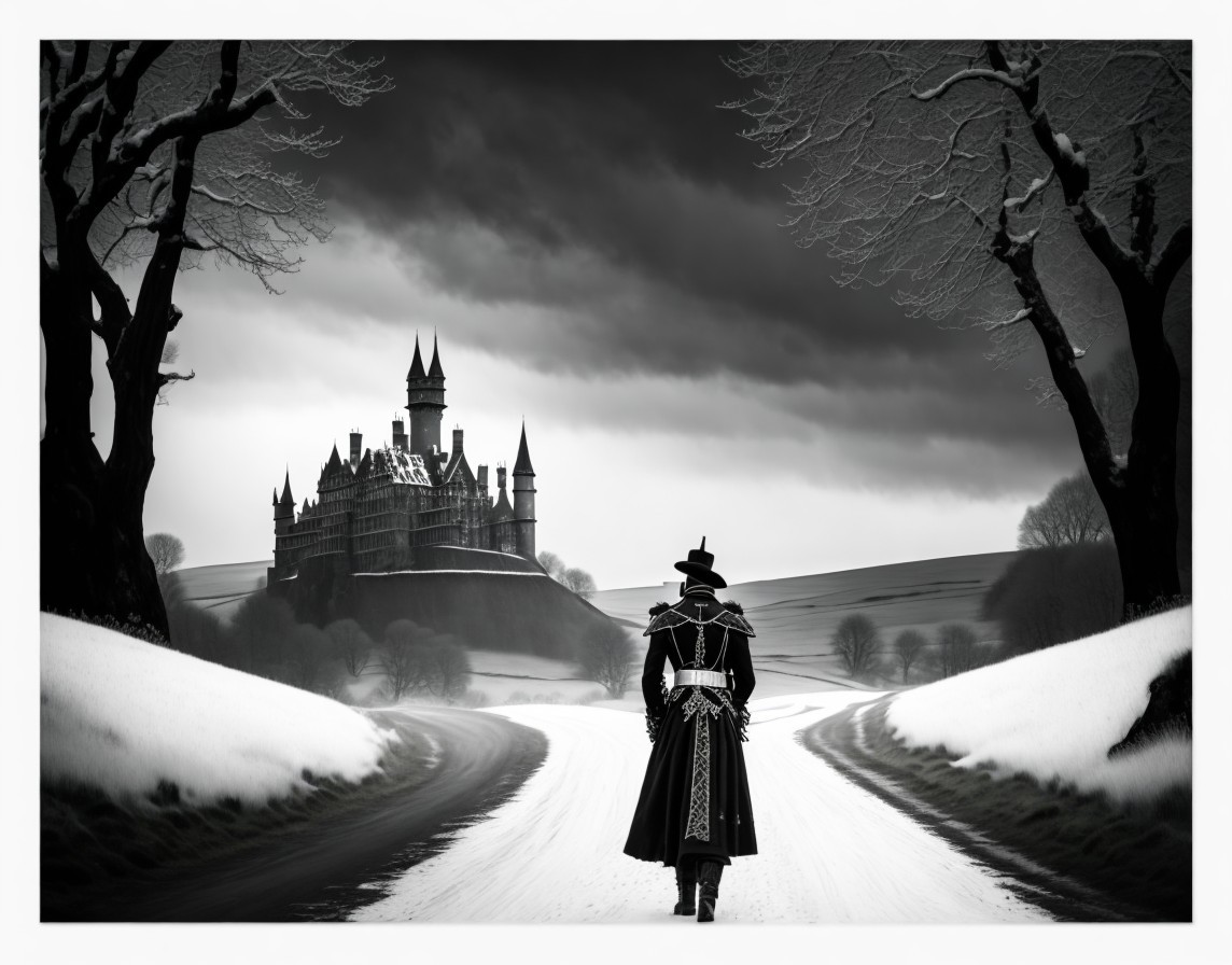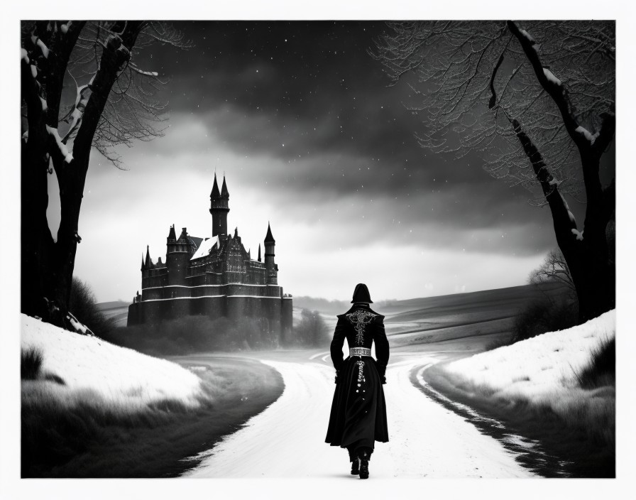 A person riding a horse-drawn carriage on a snowy road towards a grand castle, under a dramatic sky flanked by bare trees.