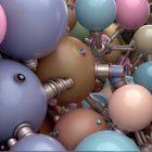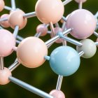 A stylized molecular structure featuring glossy pink and teal spheres connected by metallic rods. The background is a gradient of green, enhancing the futuristic and scientific look.