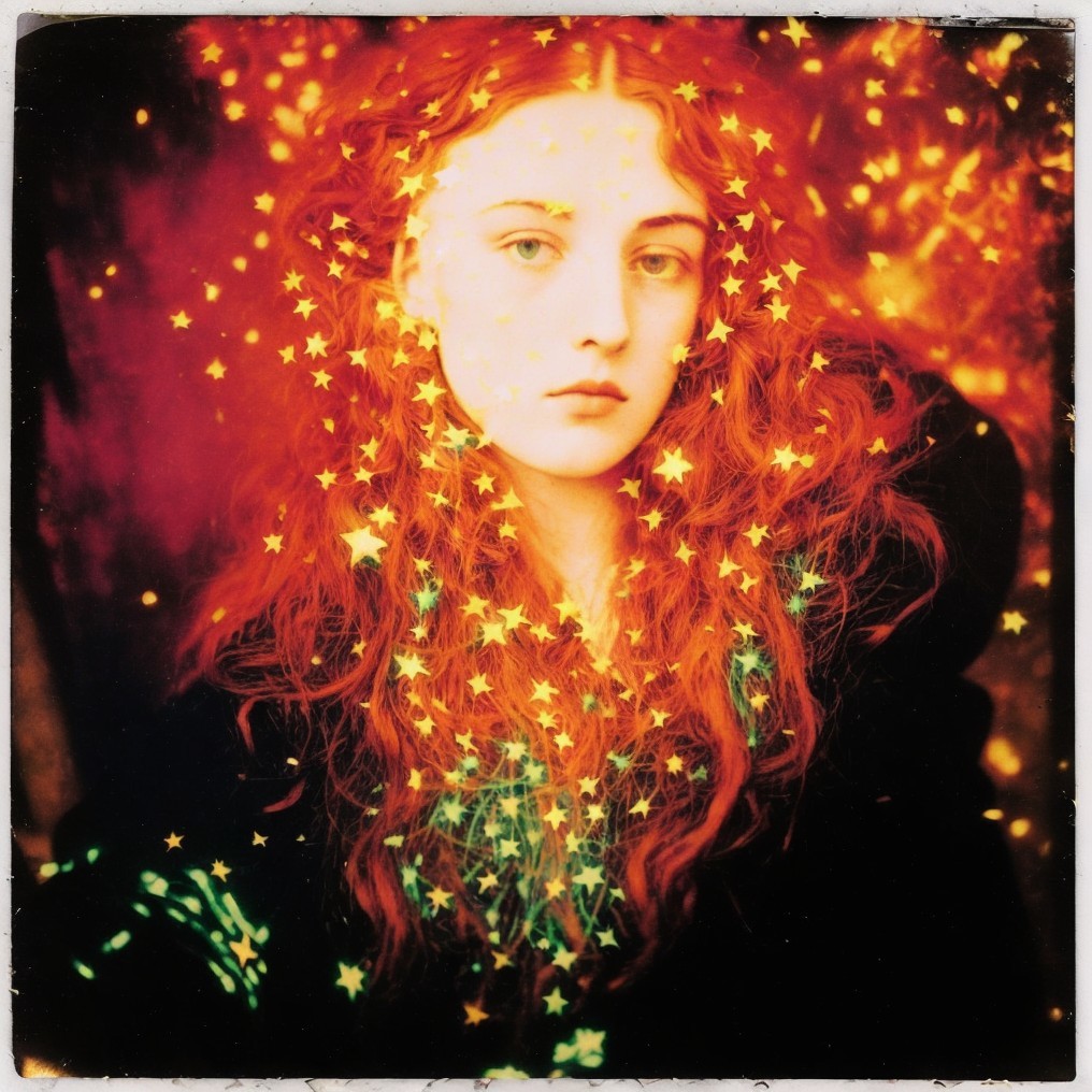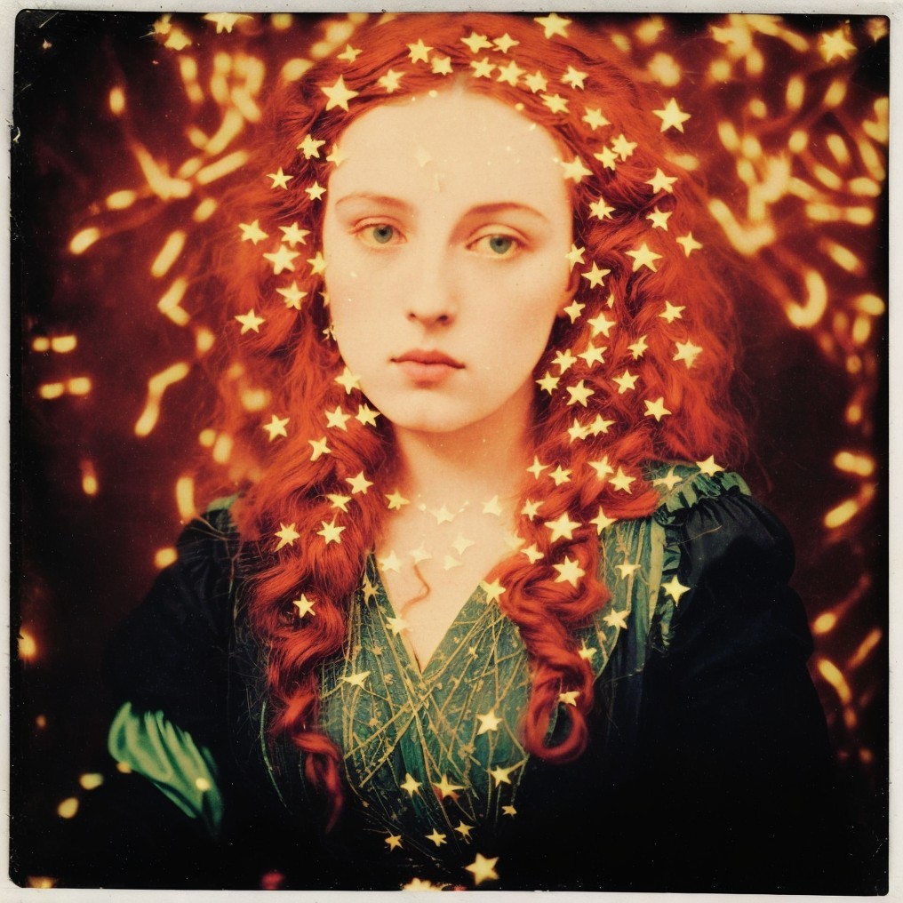 A wistful portrait of a young woman with flowing red hair adorned with stars, set against a softly glowing backdrop. She wears a richly patterned green dress, conveying an ethereal, dreamy atmosphere.
