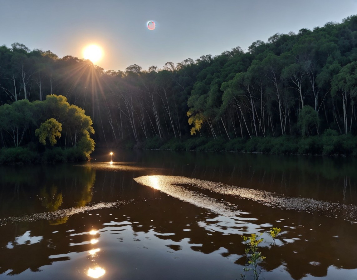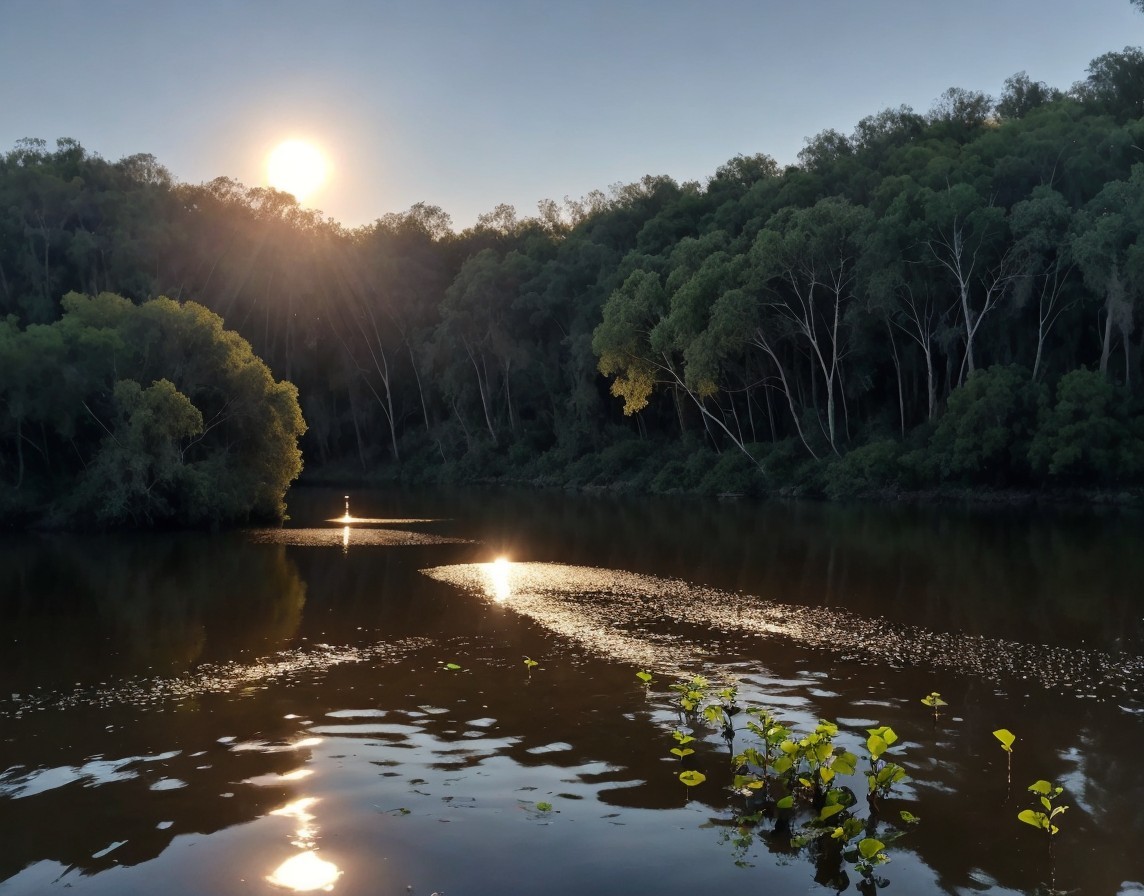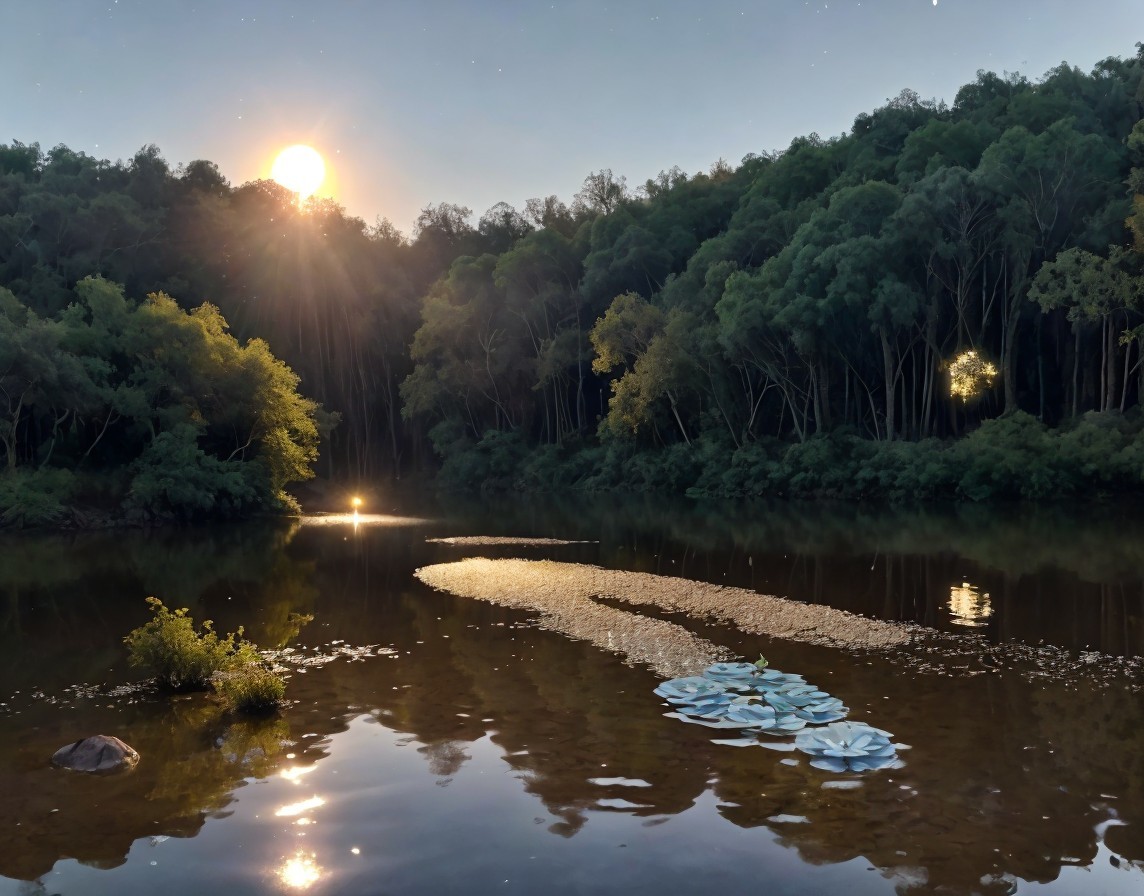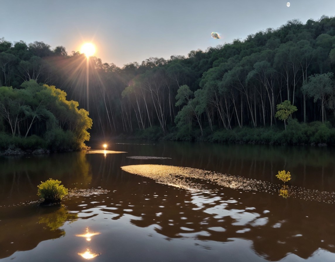 A serene twilight scene with sun reflection on a calm river, flanked by dense trees and a highlighted solitary bush.
