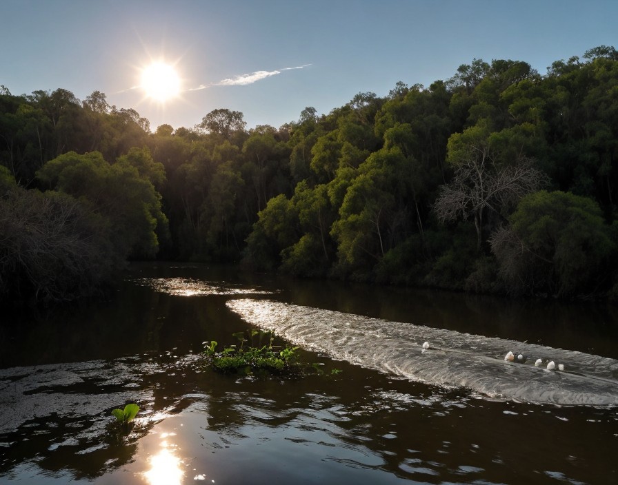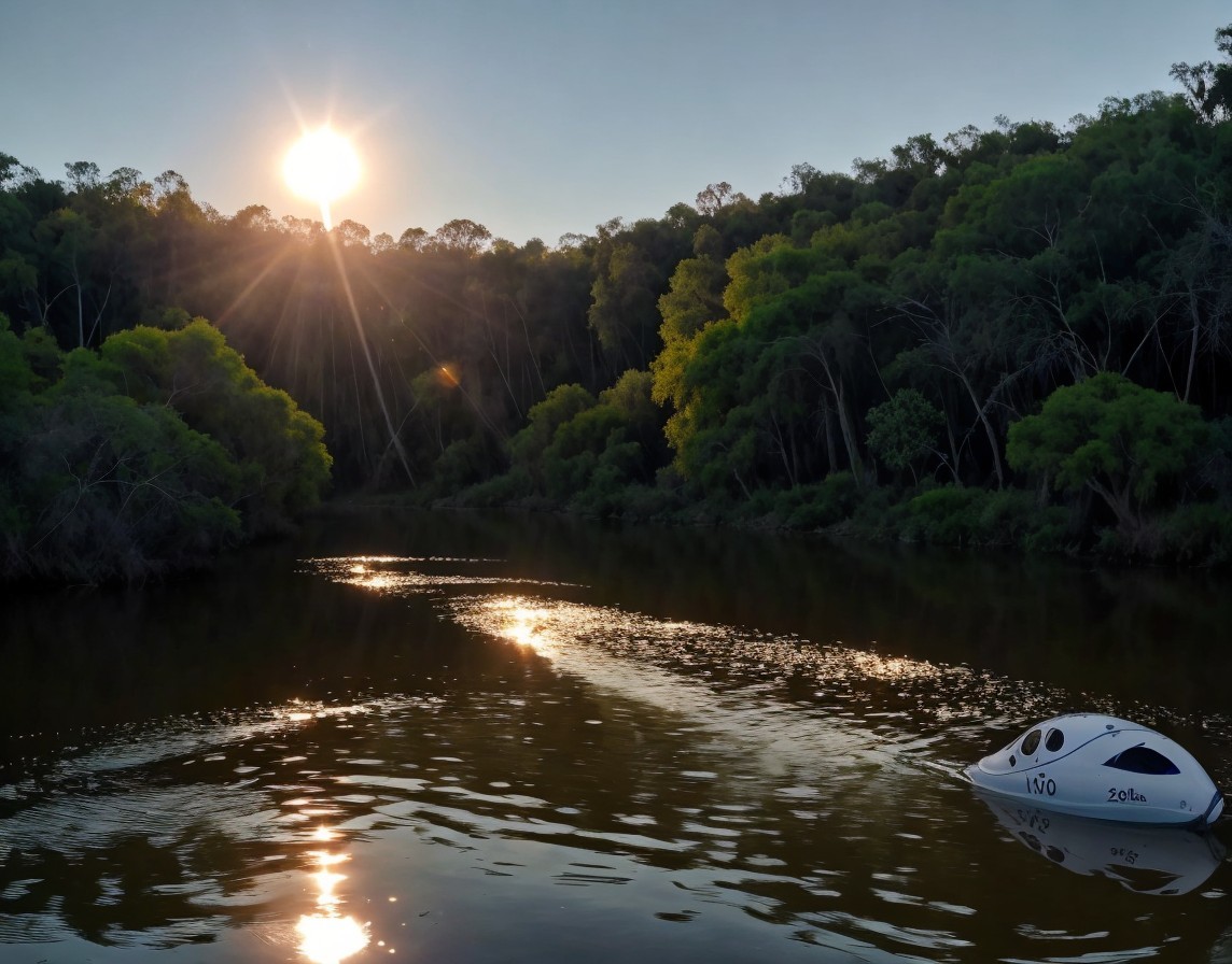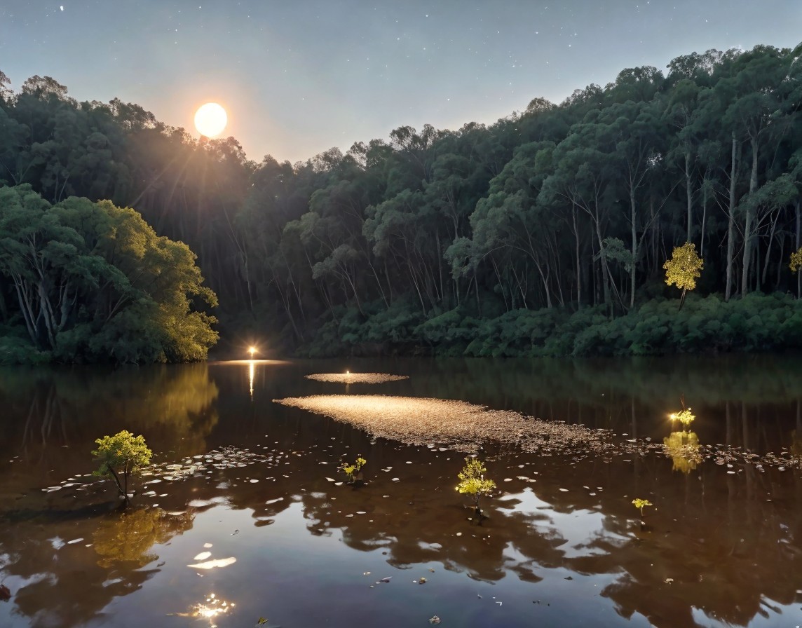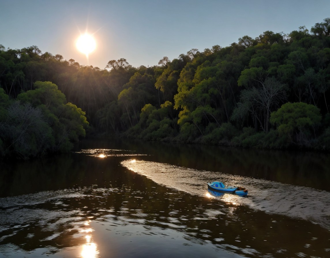 A serene twilight scene with sun reflection on a calm river, flanked by dense trees and a highlighted solitary bush.