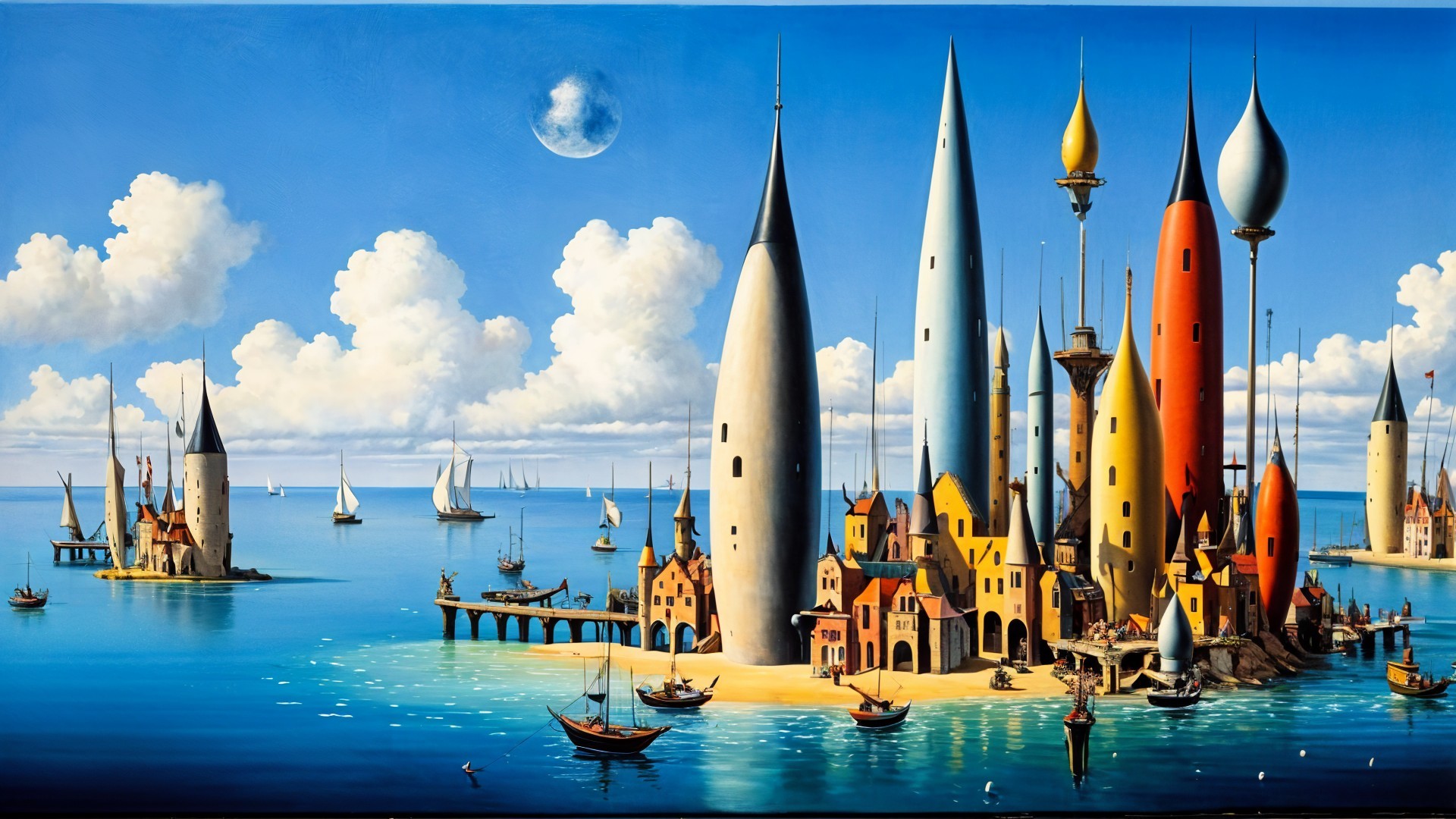 A whimsical seaside scene featuring colorful, castle-like structures with spires, set against a bright blue sky and a large moon. Small sailboats glide on calm waters near the shore.