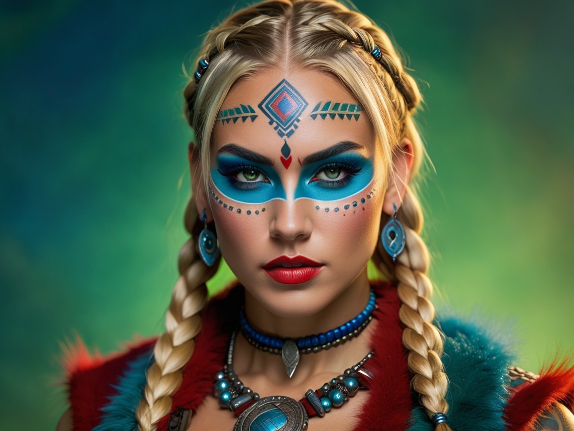 A striking portrait of a viking woman with bold, vibrant blue face paint and intricate patterns, adorned with jewelry and braided hair, exuding a fierce, mystical allure against a colorful backdrop.