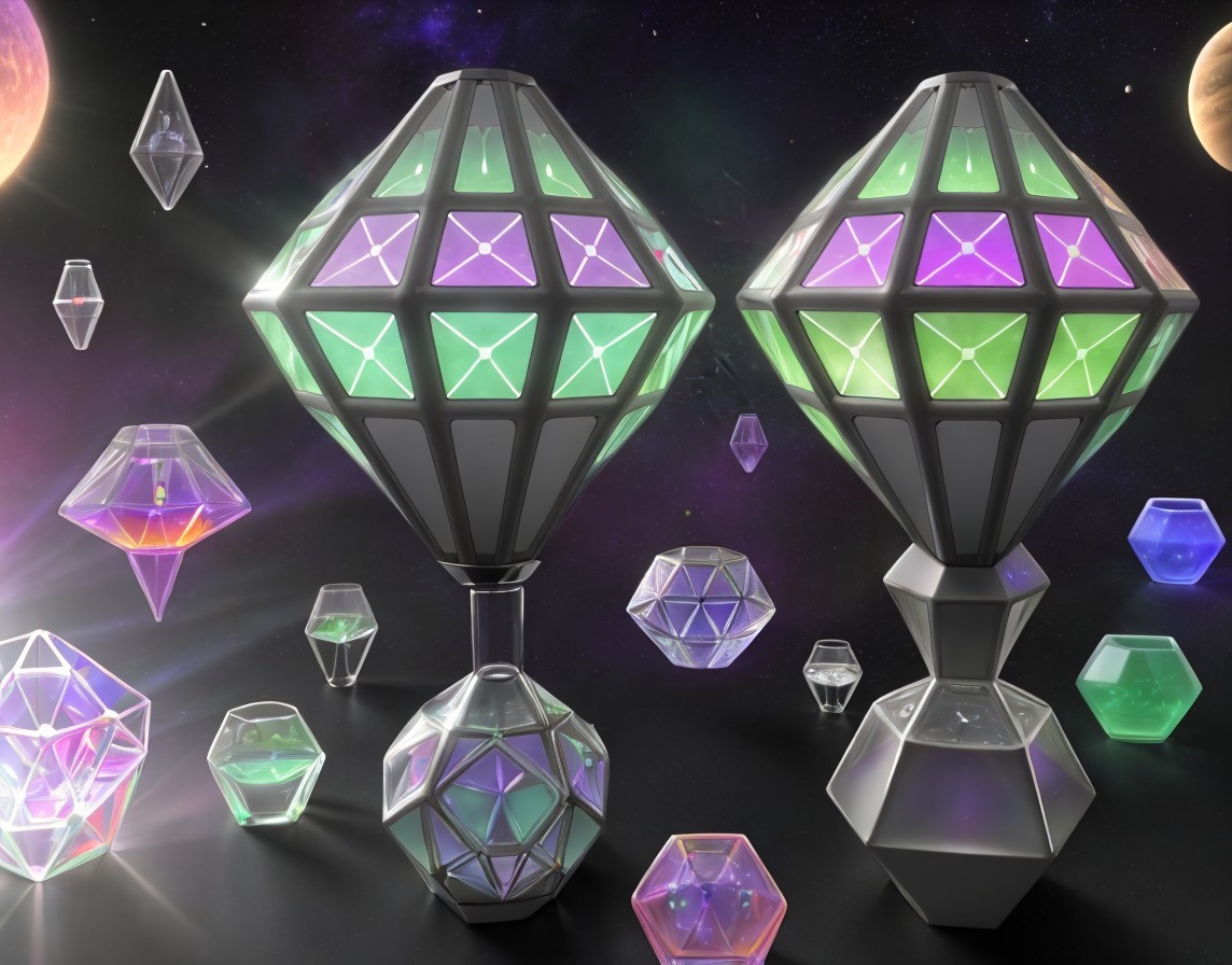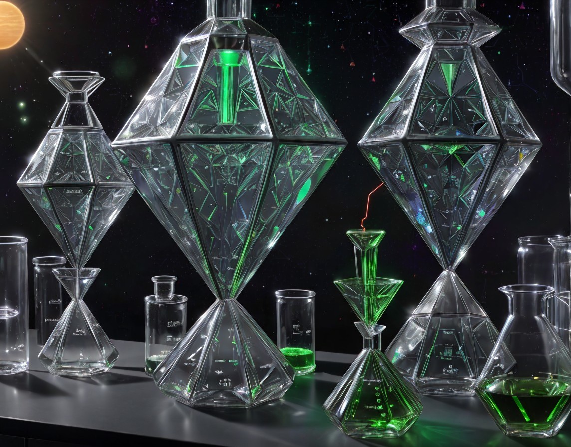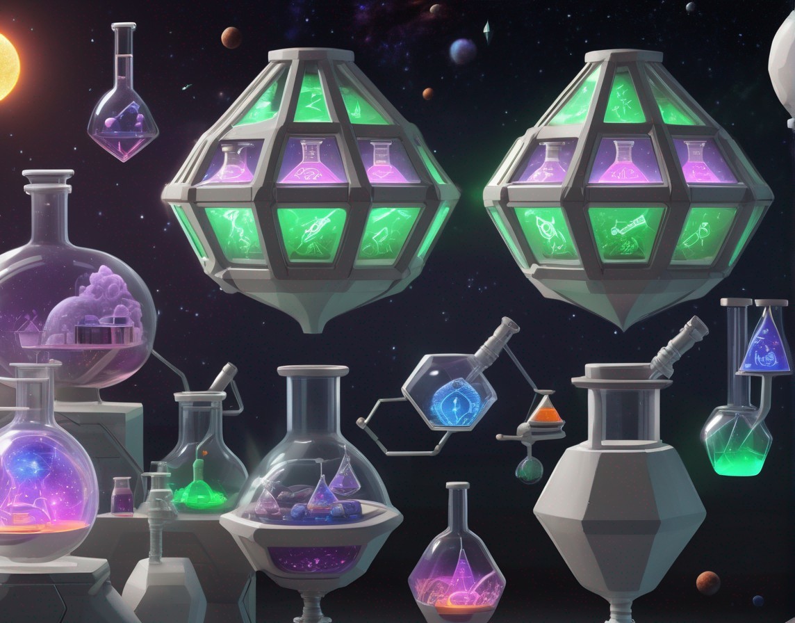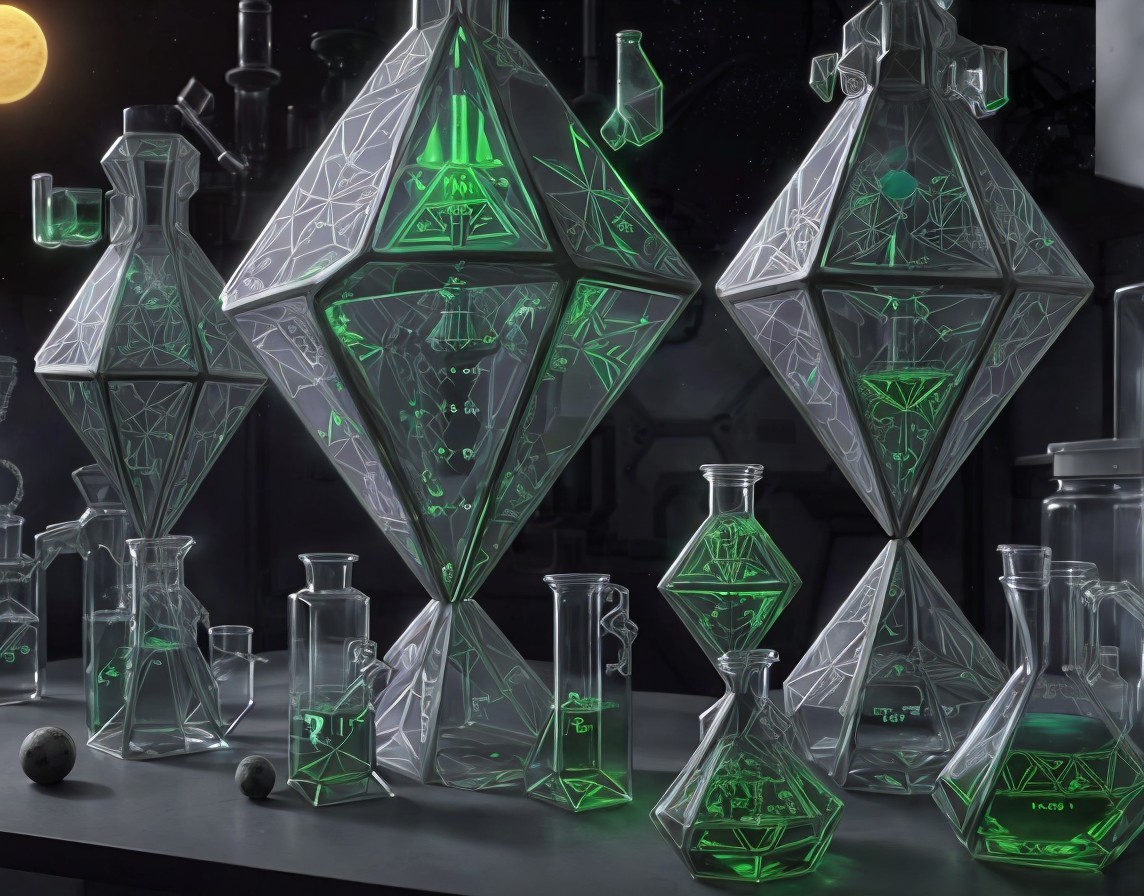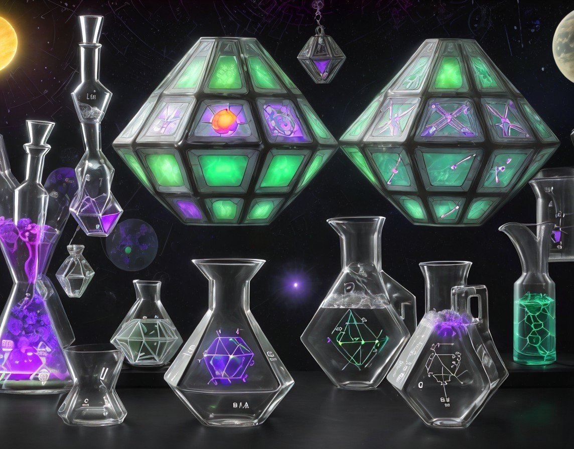 + Prompt:High-tech drug laboratory assimilated with arcane sacred geometric patterns and advanced alien technology. glowing runes and alien glyphs. geometric patterns, hexagonal patterns. Beakers, flasks and other glassware for chemistry. The sun, moon, and planets amongst billowing clouds of nebula in the sky. Ultra Realistic landscape under a complex cosmic sky. Enigmatic astral projection/alien contact, galactic LSD art, surreal psychedelic vibes, sci-fi LSD art. In the style of Cameron Gray