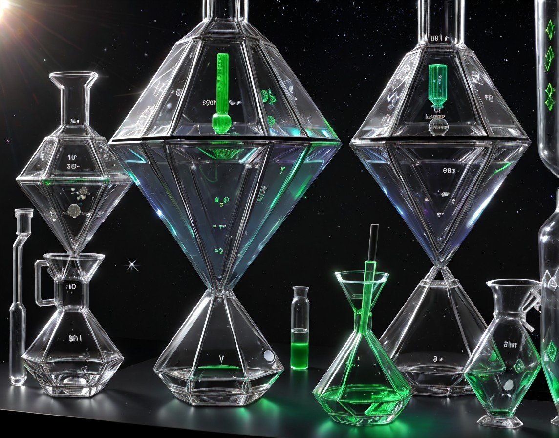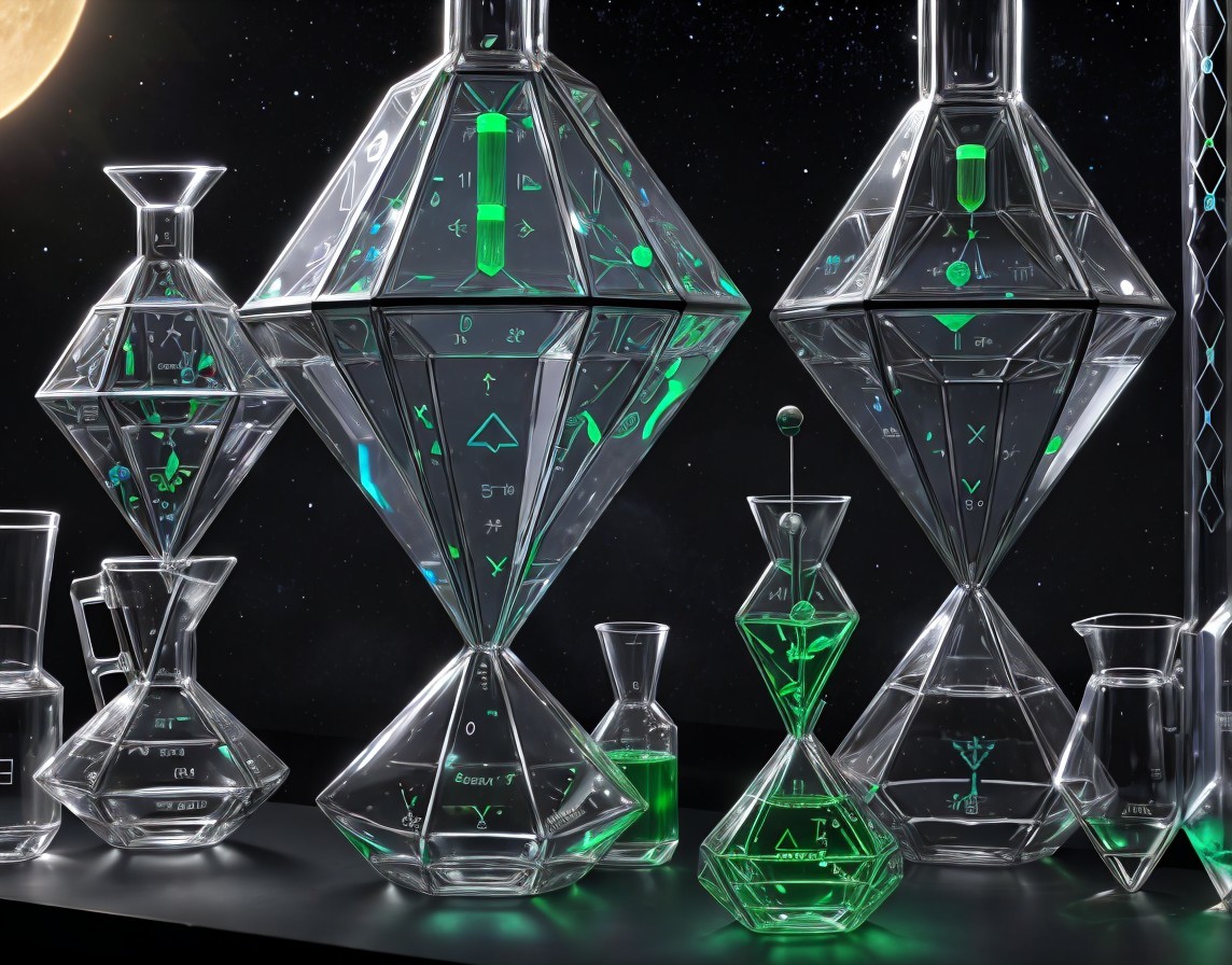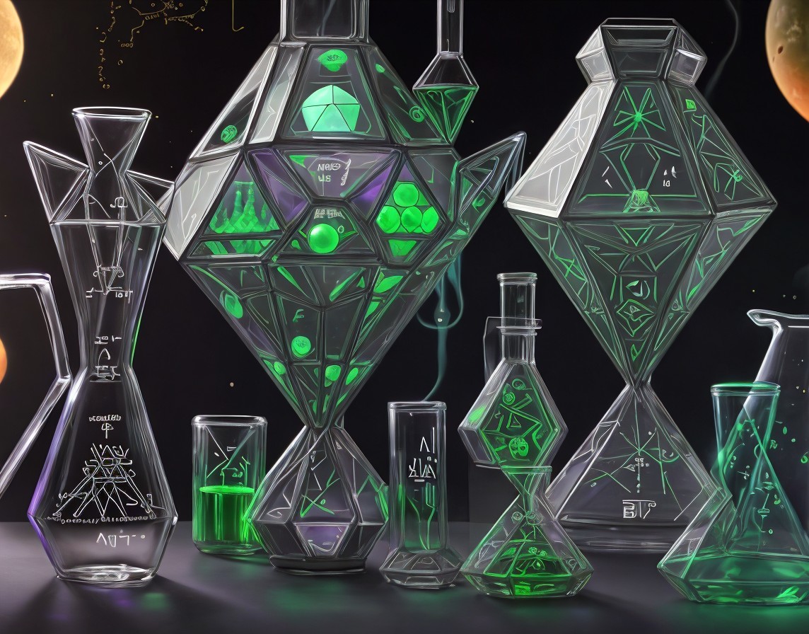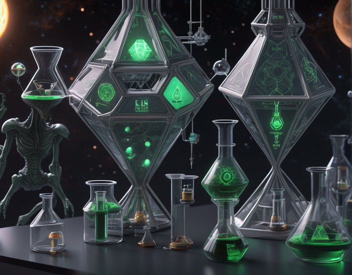 Alien doing alchemy in a High-tech drug laboratory with alien chemist, intricate glassware with bunson burner and volumetric flask. Laboratory assimilated with sacred geometric patterns and advanced alien technology. glowing runes and alien glyphs. geometric patterns, hexagonal patterns. Beakers, flasks and other glassware for chemistry. The sun, moon, and planets amongst billowing clouds of nebula in the sky. Ultra Realistic landscape under a complex cosmic sky. Enigmatic astral projection/alien contact, galactic LSD art, surreal psychedelic vibes, sci-fi LSD art. In the style of Cameron Gray