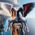 Two young women sit back-to-back on a rock overlooking a scenic ocean view. They wear casual outfits with big white sweatshirts, jeans, and sneakers, and have ethereal angel wings.