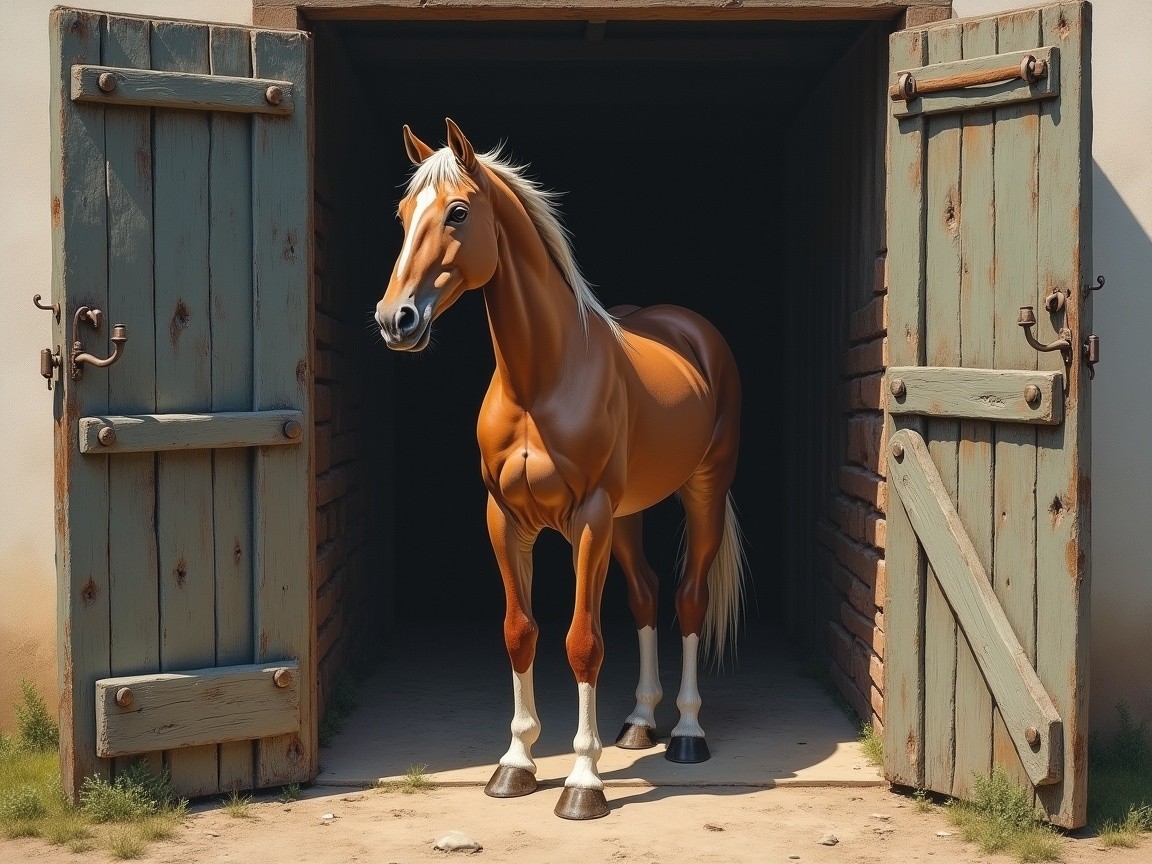 A majestic chestnut horse stands at the open door of a rustic barn, bathed in warm light, showcasing its shiny coat and strong build against a serene countryside backdrop.