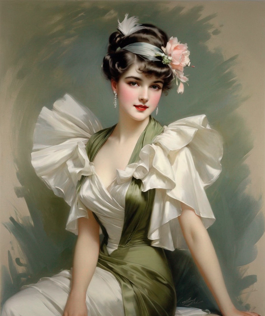 Prompt: Harrison Fisher and William de Leftwich Dodge were also captivated by her beauty, portraying her with a sense of grace and sophistication. Their paintings showcased her timeless elegance and showcased her as a symbol of class and fabulousness.